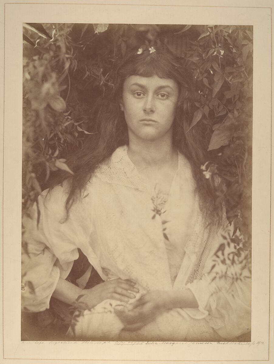 Alice Liddell (1852–1934)—who, as a child, was Lewis Carroll’s muse and frequent photographic model—posed for Cameron a dozen times in August and September 1872. Against a dense background of foliage and bedecked with flowers, the twenty-year-old Liddell was photographed by Cameron as the embodiment of fruitful abundance, Pomona, Roman goddess of gardens and fruit trees.