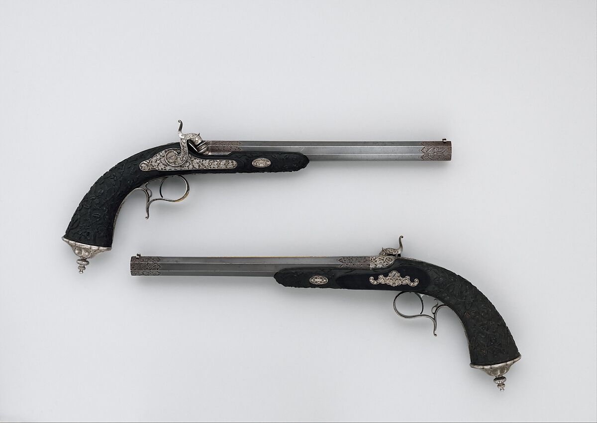 - Dimensions: Pistols (a, b); L. of each 16 in. (40.7 cm); L. of each barrel 10 5/8 in. (27 cm); Cal. of each .46 in. (12 mm); Wt. of each 2 lb. 3 oz. (992.2 g); ramrod (c); L. 11 1/4 in. (28.6 cm); Wt. 1.5 oz. (42.5 g); cleaning rod (d); L. 12 3/8 in. (31.4 cm); Wt. 1.8 oz. (51 g); mallet (e); L. 7 7/8 in. (20 cm); W. 2 1/2 in. (6.4 cm); Wt. 5.3 oz. (150.3 g); screwdriver (f); L. 6 1/4 in. (15.9 cm); Wt. 2.6 oz. (73.7 g); bullet mould (g); L. 7 7/8 in. (20 cm); Wt. 8.8 oz. (249.5 g); powder flask (h); H. 4 in. (10.2 cm); Wt. 4.2 oz. (119.1 g); patch box (i); H. 1 in. (2.5 cm); Diam. 1 1/4 in. (3.2 cm); Wt. 0.4 oz. (11.3 g); nipple box (j); H. 1 11/16 in. (4.3 cm); Diam. 1 7/8 in. (4.8 cm); Wt. 1.5 oz. (42.5 g); spoon (k); L. 4 in. (10.2 cm); Wt. 0.4 oz. (11.3 g); case (l); H. 2 7/8 in. (7.3 cm); W. 18 7/8 in. (47.9 cm); D. 8 1/4 in. (21 cm); Wt. 7 lb. 4.7 oz. (3308.4 g); leather case (m); H. 3 3/8 in. (8.6 cm); W. 19 3/8 in. (49.2 cm); D. 8 3/4 in. (22.2 cm); Wt. 3 lb. 7.5 oz. (1573.4 g)