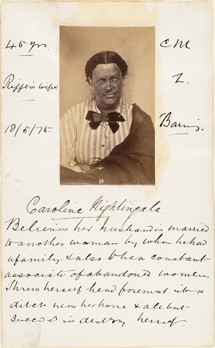 A sobering foil to the cartes-de-visite of the celebrated and powerful, these records from an unidentified British insane asylum exemplify the 19th century’s varied uses of the medium as a means of diagnosis, surveillance, and social control. The photography of mental illness has its roots in the physiognomic research of Johann Kaspar Lavater (1741-1801), who believed that diverse forms of madness could be read in the individual’s physical features. Emblems of Victorian repression, these kinds of pictures actually served multiple purposes: as a record of the patient’s initial condition, for therapeutic use with the patient to show them their progress, and as identification in case of escape. The photographs’ direct, scientific look is belied by the poignant and harrowing doctors’ notes, which tell of patients "forsaken by God". Like Alphonse Bertillon’s contemporary system of criminal identification using similar cards in Paris, the idea of a photographic archive of social "types" has served as a structural and conceptual model for artists such as Walker Evans and Diane Arbus.