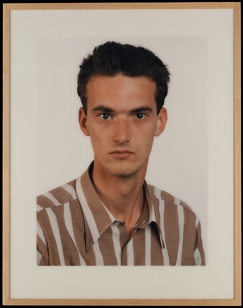During the late 1980s Ruff photographed his fellow students at the Düsseldorf Academy of Art, combining the typological mode of his teacher Bernd Becher with the serial progressions and primary structures of Minimalism. The large scale and technical perfection of Ruff's portraits refer to both the museum and the street—to billboards and heroic painting—while elevating the anonymous sitter to the stature and visibility of a public figure. Instead of presuming to depict the transcendent, individual essence of the sitter, however, Ruff's portraits deliberately assume the neutrality of the mug shot, physiognomic study, and identity card, and, by extension, the entire brightly lit world of surveillance in which his subjects were raised. The age and milieu of his sitters are crucial to the pictures' meaning: these young media-savvy people are not threatened by the camera eye but adjust themselves comfortably yet firmly to its probing vision. The results are both seductive and subtly disquieting, like studying a human specimen whose every pore and hair is available for careful study, yet whose thoughts and feelings are always just out of reach.