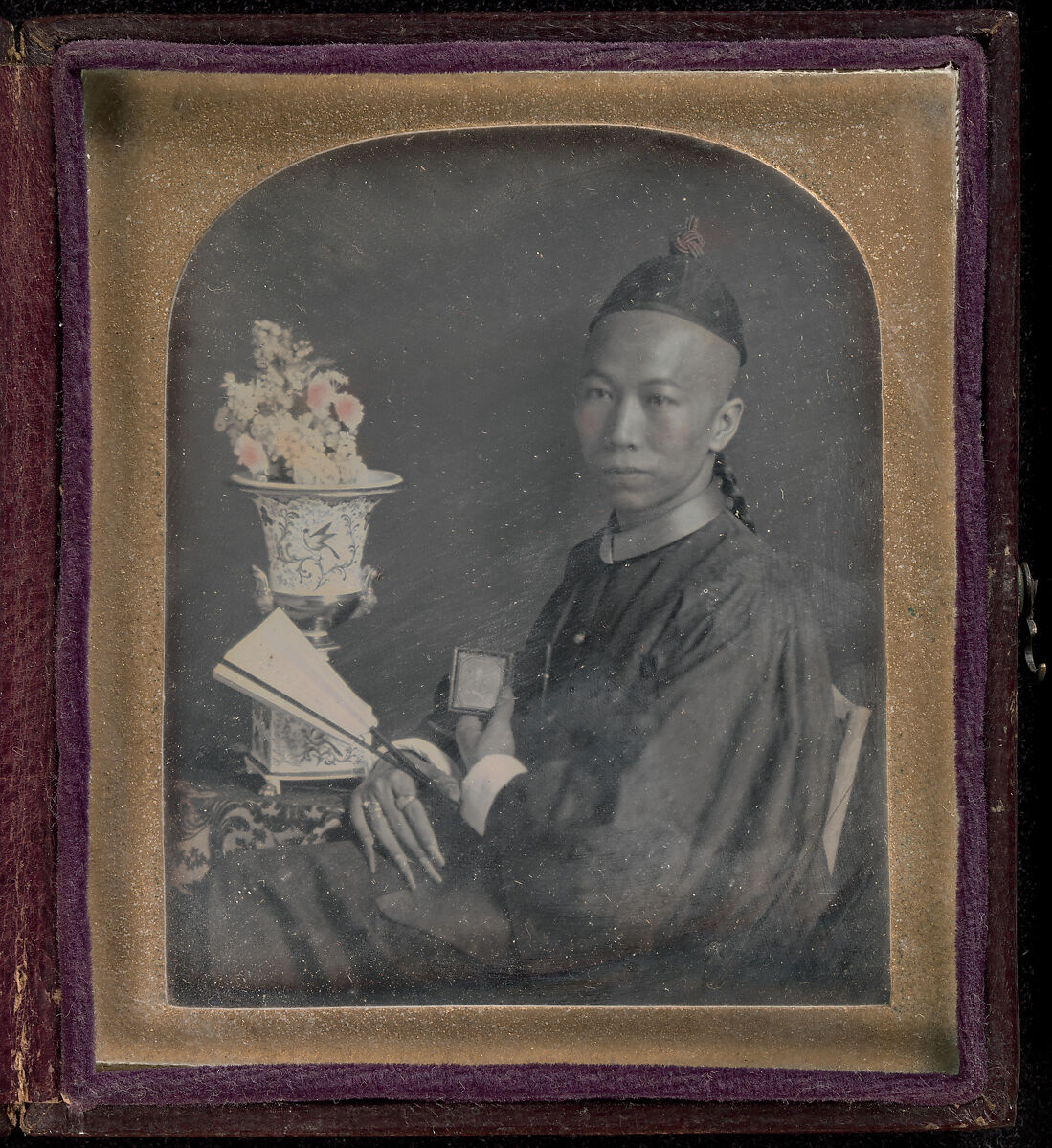 Boston’s short-lived Chinese Museum, which opened on September 8, 1845, and closed in 1847, was created on the heels of the Treaty of Wanghia, a diplomatic agreement between the United States and China. An experiment in cultural understanding, the museum attempted to illuminate Chinese character and institutions with the help of two Cantonese cultural ambassadors: the poet and music teacher, Le-Kaw-hing; and the “Writing Master,” T’sow-Chaoong, who is pictured here. Elegantly posed beside a porcelain vase of cut flowers, T’sow-Chaong holds a fan in one hand and a daguerreotype in the other; these attributes, in addition to his long fingernails, emphasize his status as a gentleman and scholar. At the museum, he demonstrated calligraphy and provided visitors, including the poet Emily Dickinson, with calling cards on which he wrote their names in Chinese symbols.