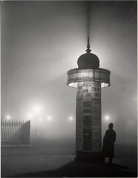 Brassaï made his name as a chronicler of the night. His book Paris de nuit (1932) surveys the activities and topography of the city after dark, from the louche bars of Montparnasse to the trees and bridges flanking the Seine. The dreamy atmosphere of Brassaï's photographs is intensified by his preference for shooting on rainy and foggy nights. "Fog and rain . . . tend to soften contrasts," he wrote. "Steam, as well as wet ground, act as reflectors and diffuse the light of the lamps in all directions. Therefore, it is necessary to photograph certain subjects in the rain, since it is the rain that makes them 'photogenic.'"