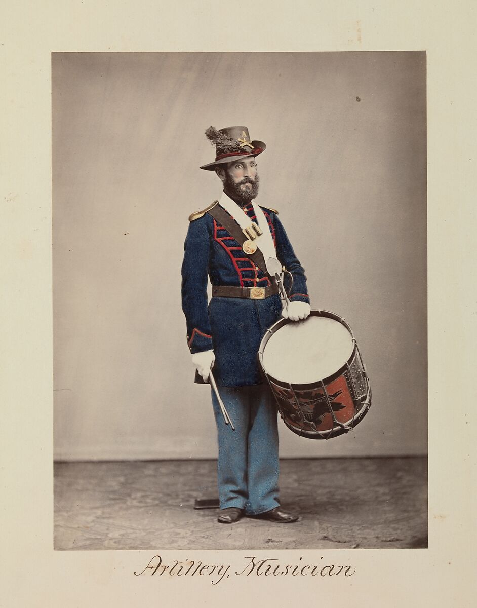This hand-colored portrait provides a good look at the colors of war—at least as worn by the Union army. It comes from a set of photographs commissioned in 1866 by Montgomery Meigs, Quartermaster General of the United States Army during and after the Civil War. Known as "the army behind the army," the Quartermaster Corps is the army’s oldest logistical branch. Then and now it is charged with clothing, transporting, and sustaining large field armies far away from their base camps. Meigs understood the historical value of permanently recording the clothing (with accurate colors) and personal accouterments worn by soldiers and officers during the war. The portraits by Oliver H. Willard, still a relatively obscure photographer, all show the same soldier/actor wearing a wide variety of uniforms and posing with the tools and emblems of his service and rank.