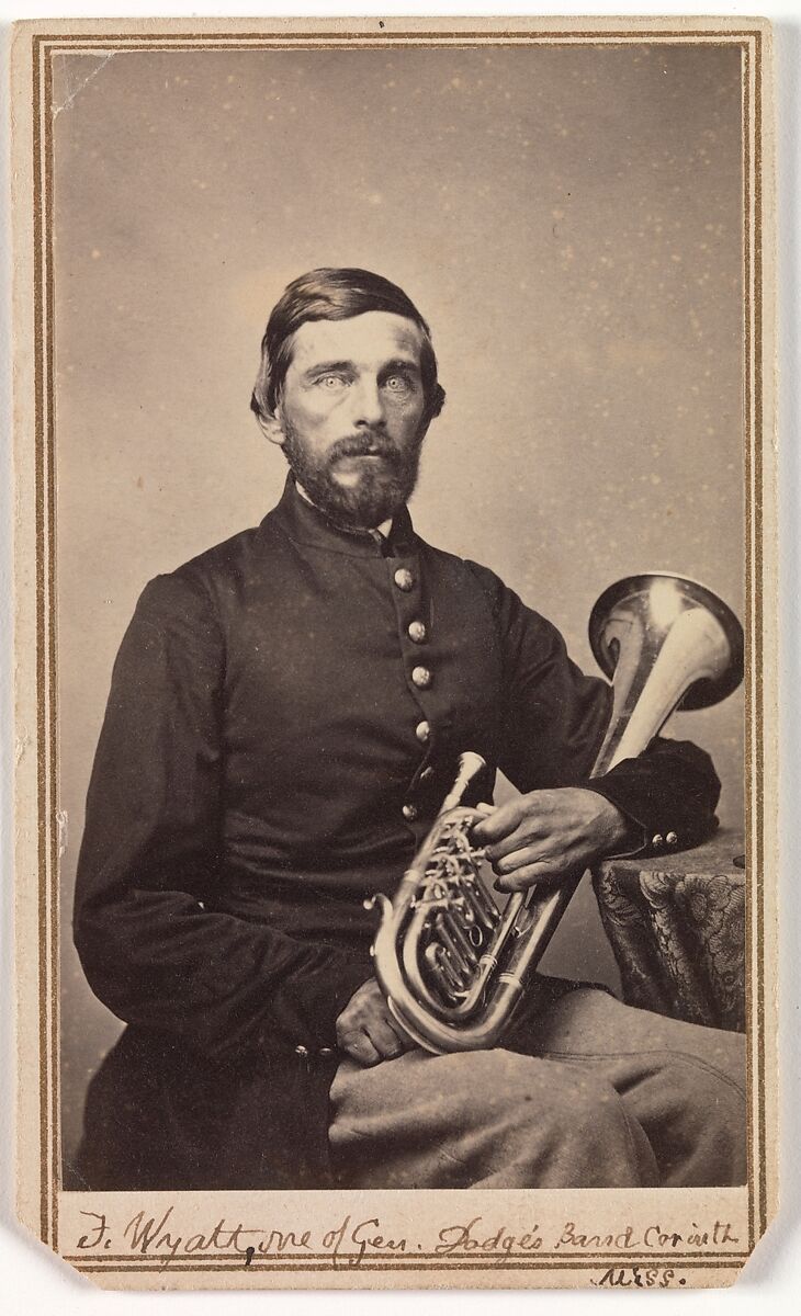 This Union portrait was made on the war’s western frontier. Frank Wyatt, cradling his saxhorn, noted on his print that he was a member of Brigadier General Grenville M. Dodge’s band and that he plays second E-flat alto. A resident of Grinnell, he joined the band of the Second Iowa Volunteer Infantry on August 22, 1862. Thirteen months into service, at age thirty-nine, he looks proud but weary. He was one of the older company members; most Union soldiers were between eighteen and twenty-nine.