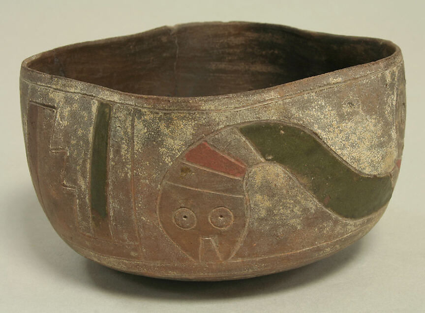 Thin walls form a deep bowl with a slightly pinched rim, shifting the edge into a soft square frame. Shallowly incised designs of fluid figures and geometric shapes ornament the exterior. A pair of curving, double-headed snakes dominate the pictorial register, separated by geometric stepped motifs and vertical bars creating an encircling repetitive pattern. Dark red and green colors stand out from the original white background and though the bowl originally displayed additional colors, such as tans, grays, and yellow, only faded traces of these colors remain. Symmetrically designed with bold and simplistic imagery, this ceramic bowl is distinctive of the post-fire painting style characteristic of pottery produced by the Paracas culture during the Early Horizon (700 B.C. – A.D. 1) in the south coast of Peru.