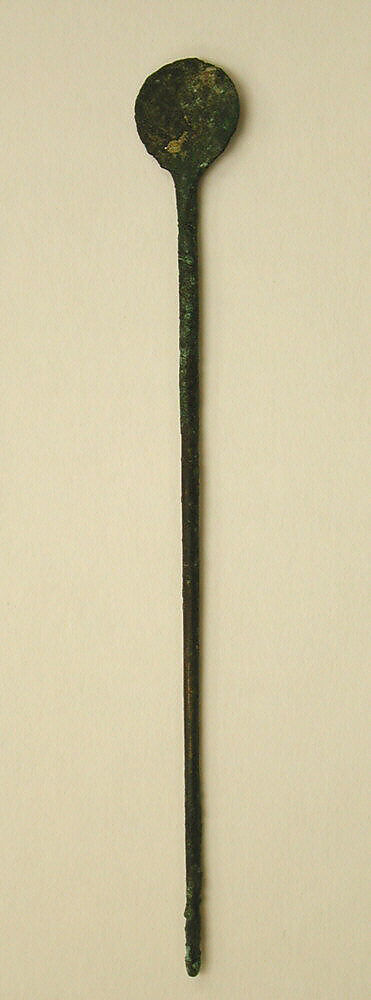 This object is a tupu, a Quechua word for pin (pithu in Aymara and alfiler in Spanish). Women in the Andes wear tupus in order to fasten textile garments. Tupus usually consist of two parts: a head and a stem. In this case, the head is circular. Its shape is distinct from tupus like Metropolitan Museum of Art 64.228.702 whose head is more elliptical in shape. Another difference is that a perforation is not seen on the present example. Often, people may wear tupus and other ornaments or tools along a cord or ribbon (see Rowe 1998, fig. 132 and Vetter 2009, fig. 6 for recent examples of this way of wearing tupus and Bjerregaard 2007, 111–13, no. CMA 1795, for an Inca example). The stem of the tupu is circular in cross section. While its end does not appear pointed, corrosion may be masking the shape with which it was designed. The stems of other tupus (e.g., Metropolitan Museum of Art 1987.394.603) clearly become narrower farther from the head, and their ends are pointed.