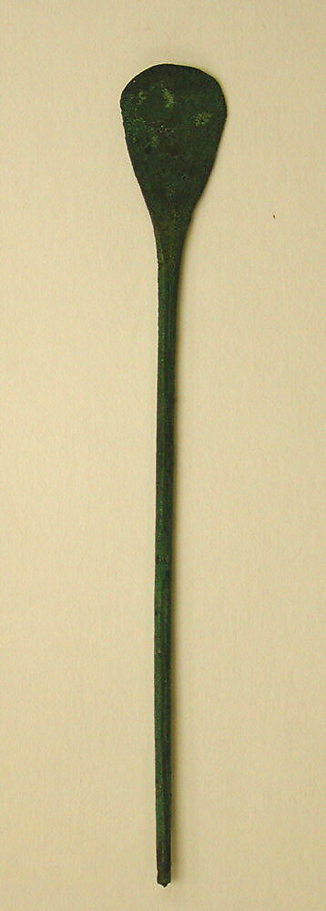 To make this tupu, metalworkers may have started with a rod of metal. Such rods are blanks, or stock metal, that were pre-fabricated for metalworkers to shape into different forms. (Please see 64.228.606 for further discussion of these blanks.) On the present example, an artist hammered the end of the pre-fabricated rod, thinning it and shaping it into the head that is seen today. They may have chiseled the edges of the head in order to refine its shape. The green natural corrosion across the surface of this object suggests that copper is present in the metal.[1]