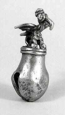 This bell with a pear-shaped resonator is surmounted by a finial in the shape of a bird, possibly an eagle or vulture, in a position suggesting that it is landing from flight. The wings of the bird are outstretched and its feet are grounded. The bird has a tuft or crest on top of its head that consists of a semispherical dome on top of a circular band. Each of its semi-spherical eyes is set into a circular band and attached to each side of the head. Its beak curves downward; the upper and lower jaw were originally formed with two separate pieces of wax, and the upper piece hooks over the lower one. Like other bells from the Central American Isthmus, the present example was lost-wax-cast, meaning that all of its metal was originally designed in wax. Casting, and slow cooling, is confirmed by the dendritic appearance of the base of the finial. When making the model of the bird, the metallurgist carefully joined four bands of wax to form each wing and six bands of wax to form the tail. On close inspection, the semi-cylindrical form of the bands (now in metal) is preserved; the wings and tail were not formed from one continuous piece of wax that was later chiseled to provide detail. The metallurgist cut the ends of these wax threads forming the wings and tail only after joining; there is a clean break at their ends, indicating one stroke of a chisel was likely used to shorten the wax. These bands of metal suggest the markings of the bird, such as the alternating rows of black and white seen on the tail and/or wings of the harpy eagle (Harpia harpyja). Alternatively, its prominent beak resembles that of the king vulture (Sarcoramphus papa) and its caruncle. A taxonomic specification may be impossible, or indeed inappropriate to the epistemologies of the peoples who made these objects.