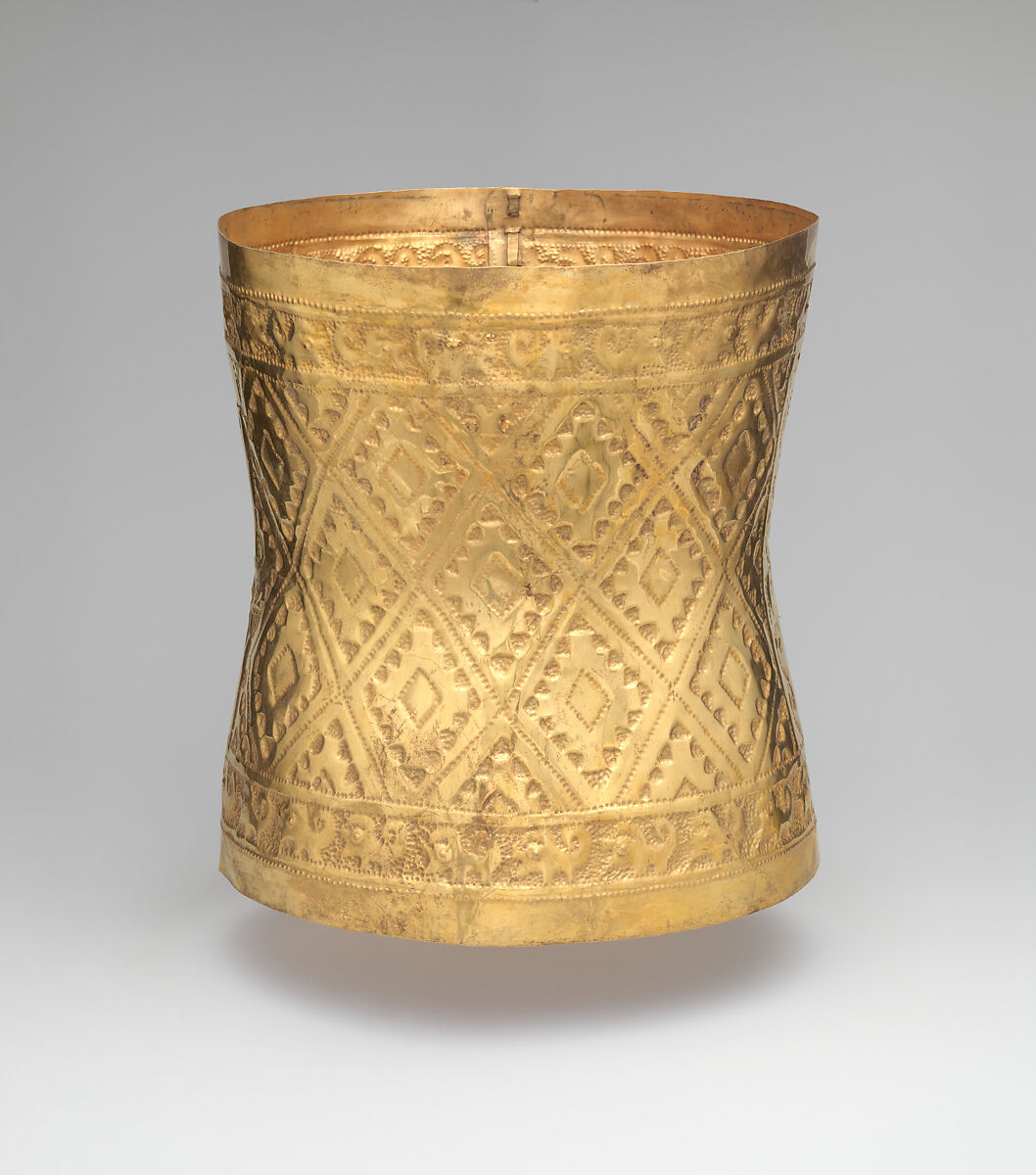 Cylindrical crowns that taper gently in the middle were common in high-status tombs at Batán Grande, a site now called the Sicán Archaeological Precinct, in the Santuario Histórico Bosque de Pómac, about 40 kilometers northeast of the modern city of Chiclayo on Peru’s North Coast. Made of sheet metal—in this case, an alloy of 44 percent gold, 32 percent silver, and 24 percent copper—it was worked from behind (repoussé) and from the front into a textile-like stepped-diamond pattern contained within an upper and lower border of animals in profile. The ends of the sheet were joined by metal lacing, as if it were a cloth.