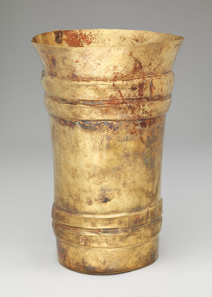This flared beaker likely once held ritual liquids, possibly chicha, a fermented corn beverage imbibed widely throughout what is now South America. Created by artists of the Lambayeque (also known as Sicán) culture, the vessel was fashioned from a blank or ingot that was first hammered into a thin sheet then shaped over a wooden mold. Such standardization allowed the Lambayeque to develop a highly sophisticated large-scale industry around smelting and metalworking on the northern Pacific coast of Peru, so much so that a single high-status burial could include hundreds of metal objects. This particular beaker features a non-figural design of parallel lines rendered in repoussé, both at the top and near the base of the vessel. Lambayeque metallurgists created such objects in workshops, using long blowpipes made of reeds and fitted with ceramic tips to regulate, with extraordinary control, the temperature and air flow within furnaces.