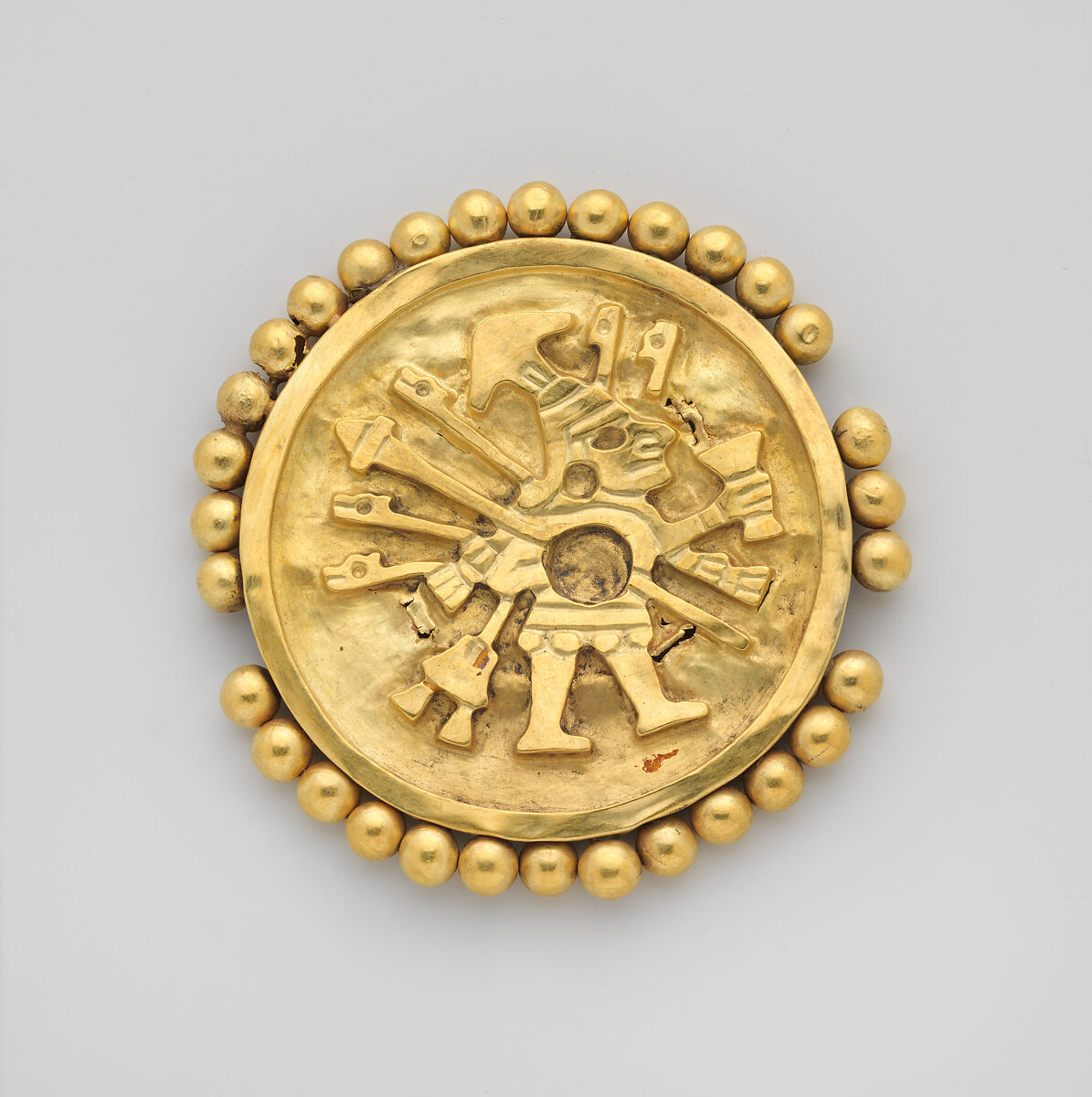 One of a pair of ear flare frontals with MMA 66.196.39, the cylindrical shaft that would have been attached to the frontal and inserted in the earlobe is now missing. These frontals, cut from hammered gold sheet and worked from behind to create the figure of a warrior, were embellished with hollow gold spheres soldered to the edges of the ornament (some now missing). The figure wears a helmet with a crescent-shaped ornament projecting upward, a tunic, and a trapezoidal back flap—a type of body armor—with two appendages. In one hand, the warrior carries a circular shield (which may have once held a turquoise inlay), a mace, as well as spears with animal heads; in the other he holds a goblet.