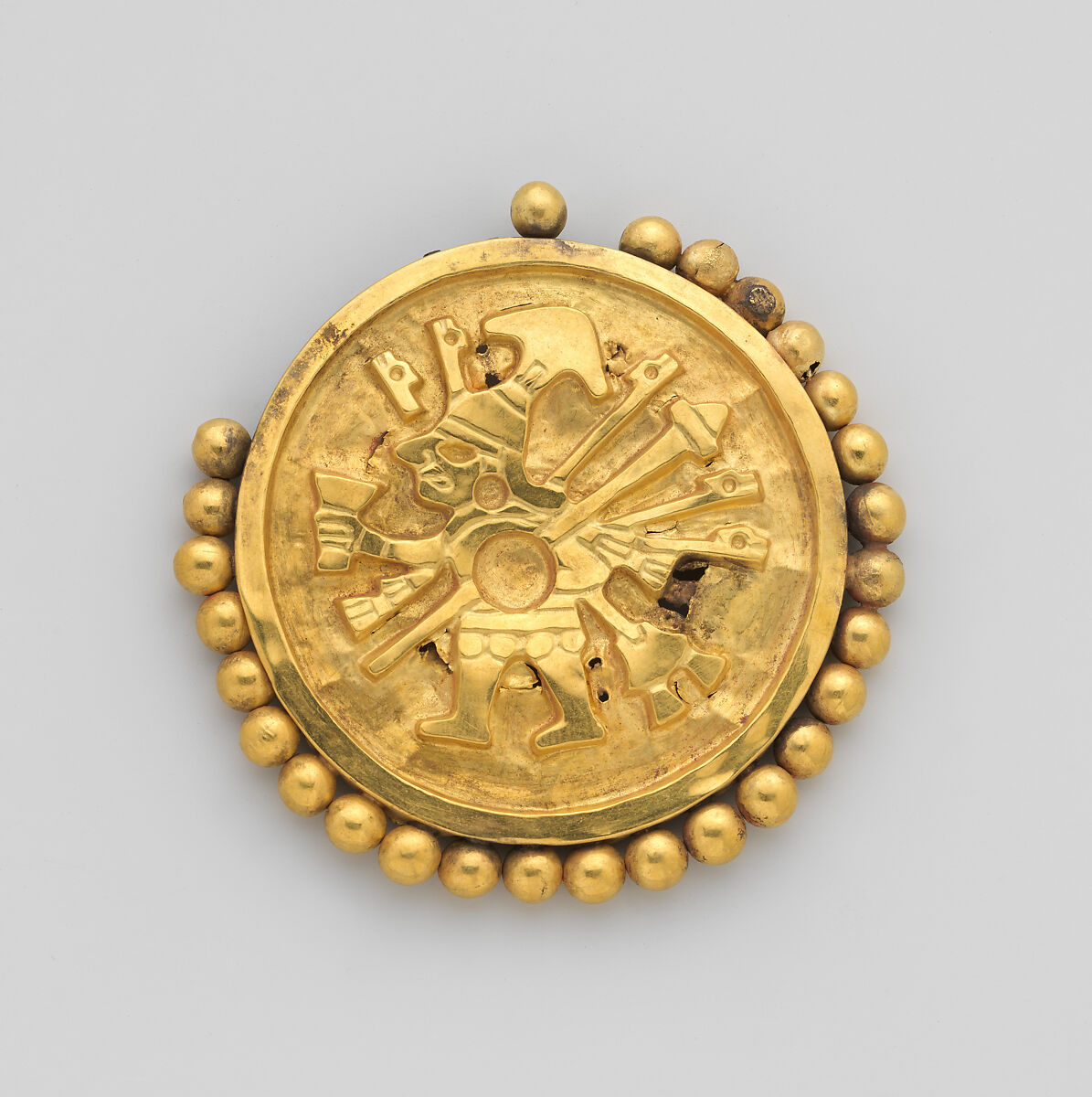 One of a pair of ear flare frontals with MMA 66.196.38, the cylindrical shaft that would have been attached to the frontal and inserted in the earlobe is now missing. These frontals, cut from hammered gold sheet and worked from behind to create the figure of a warrior, were embellished with hollow gold spheres soldered to the edges of the ornament (some now missing). The figure wears a helmet with a crescent-shaped ornament projecting upward, a tunic, and a trapezoidal back flap—a type of body armor—with two appendages. In one hand, the warrior carries a circular shield (which may have once held a turquoise inlay), a mace, as well as spears with animal heads; in the other he holds a goblet.