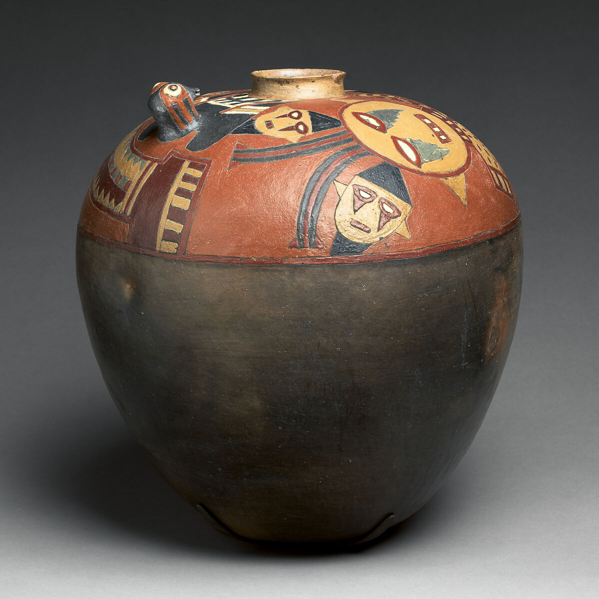 For several centuries around the time of the beginning of the Common Era, artists on Peru’s South Coast developed a striking style of ceramics featuring a colorful palette achieved with post-fire paints, known as Paracas (see, for example, MMA 1979.206.1148). Combining mostly mineral pigments with a binding agent, artists created paints that were applied on the surface of the pottery post firing (Kriss et al., 2018). At a time when most ceramics in the Central Andes were of muted colors, the Paracas palette was a significant innovation. Some designs in Paracas pottery derived from earlier traditions in the north, such as Cupisnique and Chavín, while others were specific to the Ica region, including a figure dubbed the Oculate Being by contemporary scholars (see, for example, MMA 63.232.79 and 1976.287.31).
