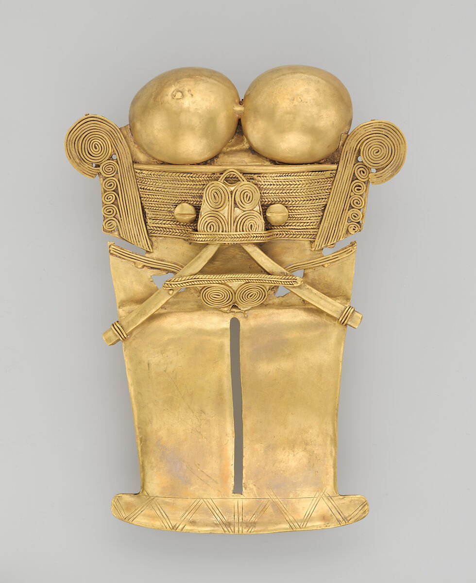 En las tradiciones orfebres más tempranas de la América antigua, específicamente en Sudamérica, el oro se martillaba primero para formar láminas y luego se moldeaba, cortaba y en ocasiones se decoraba con la técnica de repujado, entre otras. Durante los primeros siglos de la era común (EC), en la región Quimbaya de Colombia, se desarrolló otra tradición orfebre que utilizaba la técnica de fundición a la cera perdida. Esta tecnología se extendió eventualmente a otras partes de Colombia, Panamá y Costa Rica. Aunque hay temas y estilos compartidos a lo largo de este vasto territorio, en cada región surgieron estilos específicos a través del tiempo. Los productos de orfebrería preferidos en esta área fueron los adornos corporales pequeños, pero extremadamente intricados. Algunos de estos objetos fueron usados en vida por individuos de alto estatus antes de pasar a formar parte de ofrendas funerarias, mientras que otros parecen haber sido fabricados específicamente para depositarse en los enterramientos.