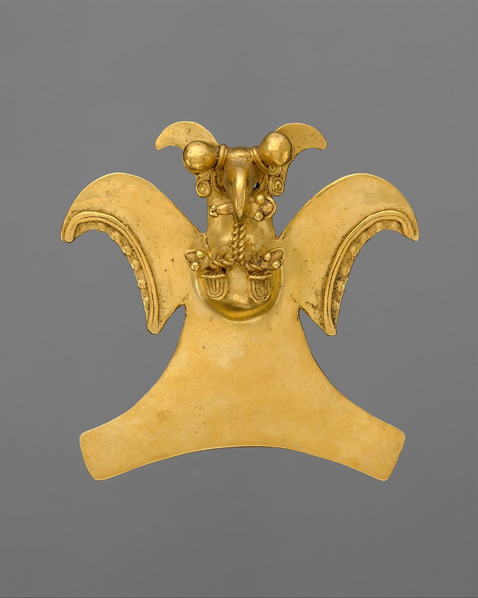 When Spaniards arrived on the coast of what is now Costa Rica in the sixteenth century, they encountered individuals wearing “águilas” (Spanish for eagle) or avian pendants suspended from cords around the neck. A photograph of Antonio Saldaña, one of the last kings of the Bribris, taken in the late nineteenth or early twentieth century, shows him wearing some half dozen of these ornaments. Although it is difficult to pinpoint the exact species of bird represented here as these pendants mix closely observed details from the natural world in imaginative ways, it is clearly a bird of prey, perhaps a harpy eagle, shown with a fishlike creature in its beak from which descends a double-headed serpent. Carefully cast using the lost-wax method, the bird features a band of raised dots on the underside of the wing, spiral earspools, and eyes that function as bells, complete with clappers.