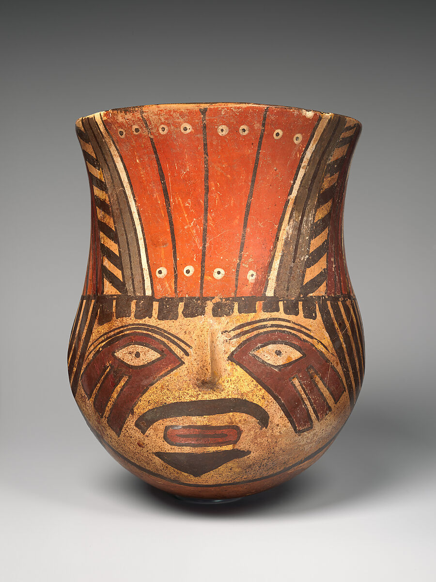 Polychrome pottery such as this head jar was crafted in the surroundings of Cahuachi, the most important ceremonial center on the Peruvian South Coast during the first centuries CE. Used and exchanged in large festivities that congregated participants from close and distant towns, these ceramics were taken home as symbols of prestige and bearers of images with religious meanings. These colorful vessels have been found by archaeologists in all kinds of houses, regardless of the status of their residents. Head jars such as this example, however, were special possessions of only the most affluent families (Vaughn 2005).