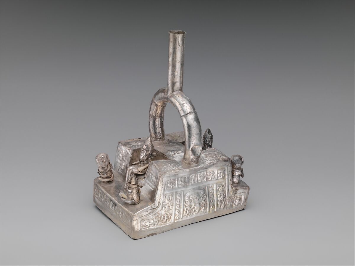 This bottle, made of pieces of silver sheet that were cut, embossed, and soldered together to create a vessel with a body in the shape of an architectural platform with figures, may have been meant to evoke an area within the Chan Chan palaces. A central figure with a conical headdress and large ear ornaments is shown seated within a niche-like space, flanked by two figures seated in front of him, one wearing a similar conical headdress and ear ornaments, and the other bearing what may be a sack over his shoulders. The scene is repeated on the opposite side of the vessel. The walls of the structure are decorated in the style of the Chan Chan palaces and other nearby structures such as Huaca el Dragón, with reliefs depicting figures with crescent headdresses and marine birds. The principal individuals are seated on throne-like audiencias—U-shaped structures that were often located adjacent to storage facilities. Whether the figures with sacks over their shoulders were intended to represent long-distance traders or bringers of tribute is unknown, but surely the scenes speak to some sort of interchange within the walls of this wealthy city.