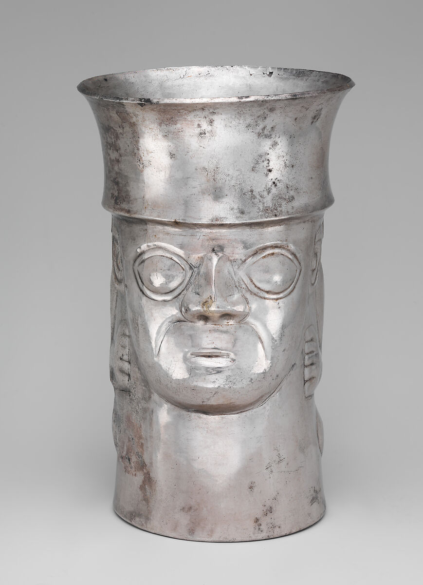 This vessel was reportedly part of a large group of silver objects recovered from a single site on Peru’s North Coast—in one account, the site of Mocollope, in the Chicama Valley; in another, in the Moche Valley, near Chan Chan, capital of the Chimú kingdom. The group includes a range of forms, from elegantly plain, tall beakers to containers in the form of human figures and animals. Chimú leaders, and the lords of another North Coast dynasty, known as Lambayeque or Sicán, dedicated far more resources to the creation of impressive drinking vessels in silver and gold than their predecessors. The presence of such a large number of capacious beakers speaks to a reorientation in ritual practice toward larger, more inclusive gatherings. Filled with maize beer, known as chicha, such vessels were part of convivial celebrations that were the building blocks of community formation. Drinking rituals were about communing with divine powers, but they were also about establishing, strengthening, and delineating relations among humans. These vessels, so prominent in public and private rituals, were opportunities for the expression of ideas in visual form, and they became a primary means by which such ideas were shared across time and place.