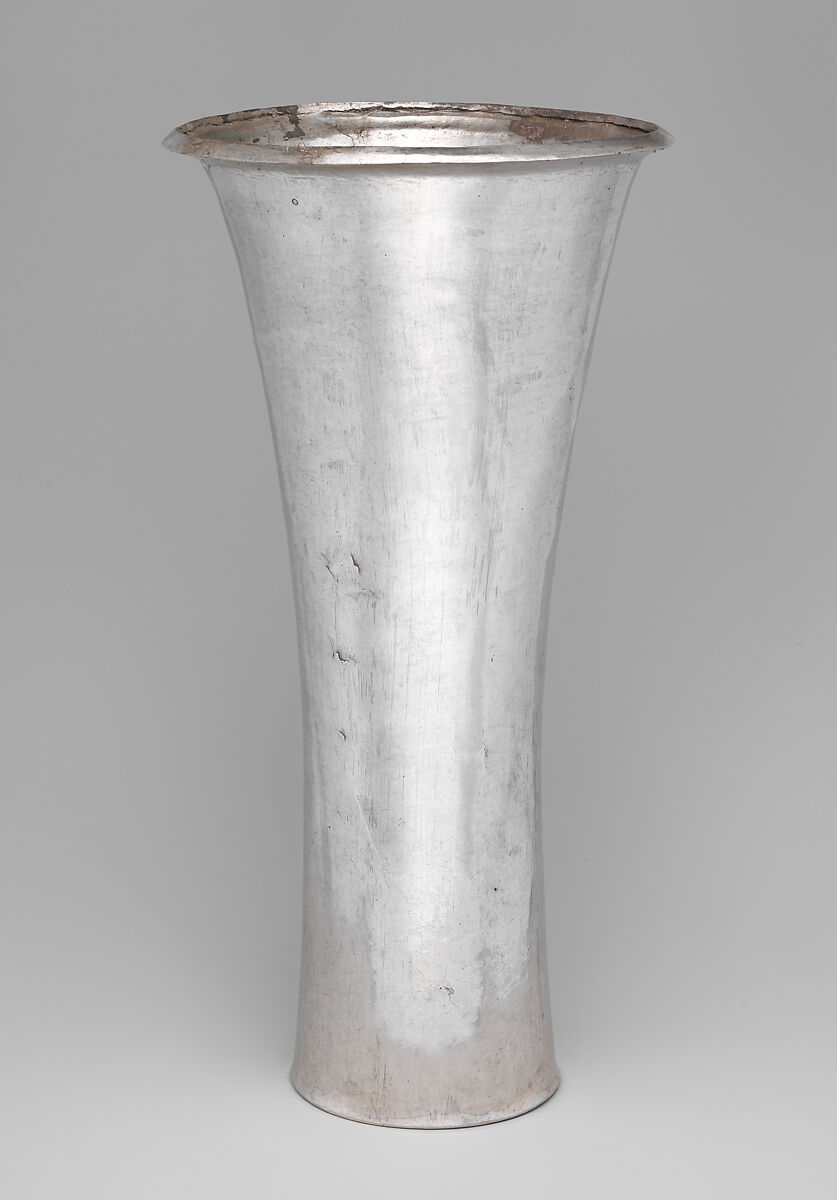 Unlike gold, which was available as nuggets and flakes in alluvial deposits and worked by metal artists of Peru’s North Coast since at least the first millennium BCE, working silver was a more complex process. Silver had to be sourced in veins in the highlands and then smelted (separated from other minerals) and refined. Chimú metalsmiths mastered the necessary technologies and brought silver working to new heights after 1000 CE. Silver was used to create items of personal adornment, but it was especially popular for drinking and serving vessels such as this tall flaring beaker, elegant in its minimalist simplicity.