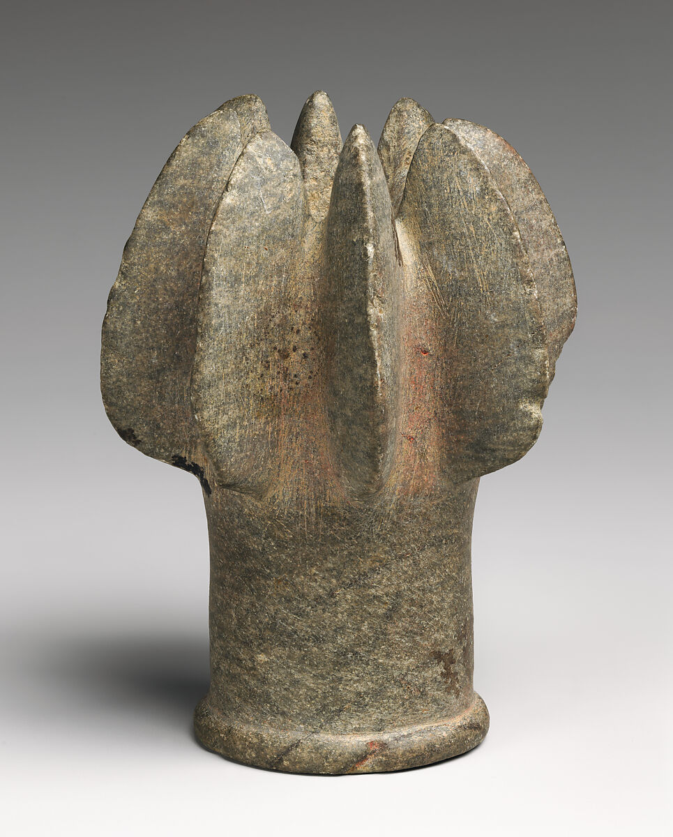 This carefully carved mace head is crowned by eight vertical fan-like projections or flanges. A hollow central core would have allowed for the insertion of a wood shaft to serve as a handle. Such weapons were deadly effective: the narrow edges of the projections provide points of contact that would have exerted much more force than when struck than a simple round stone, similar to the way in which being stepped upon by a stiletto heel is much more painful than being stepped upon by a wider heel.