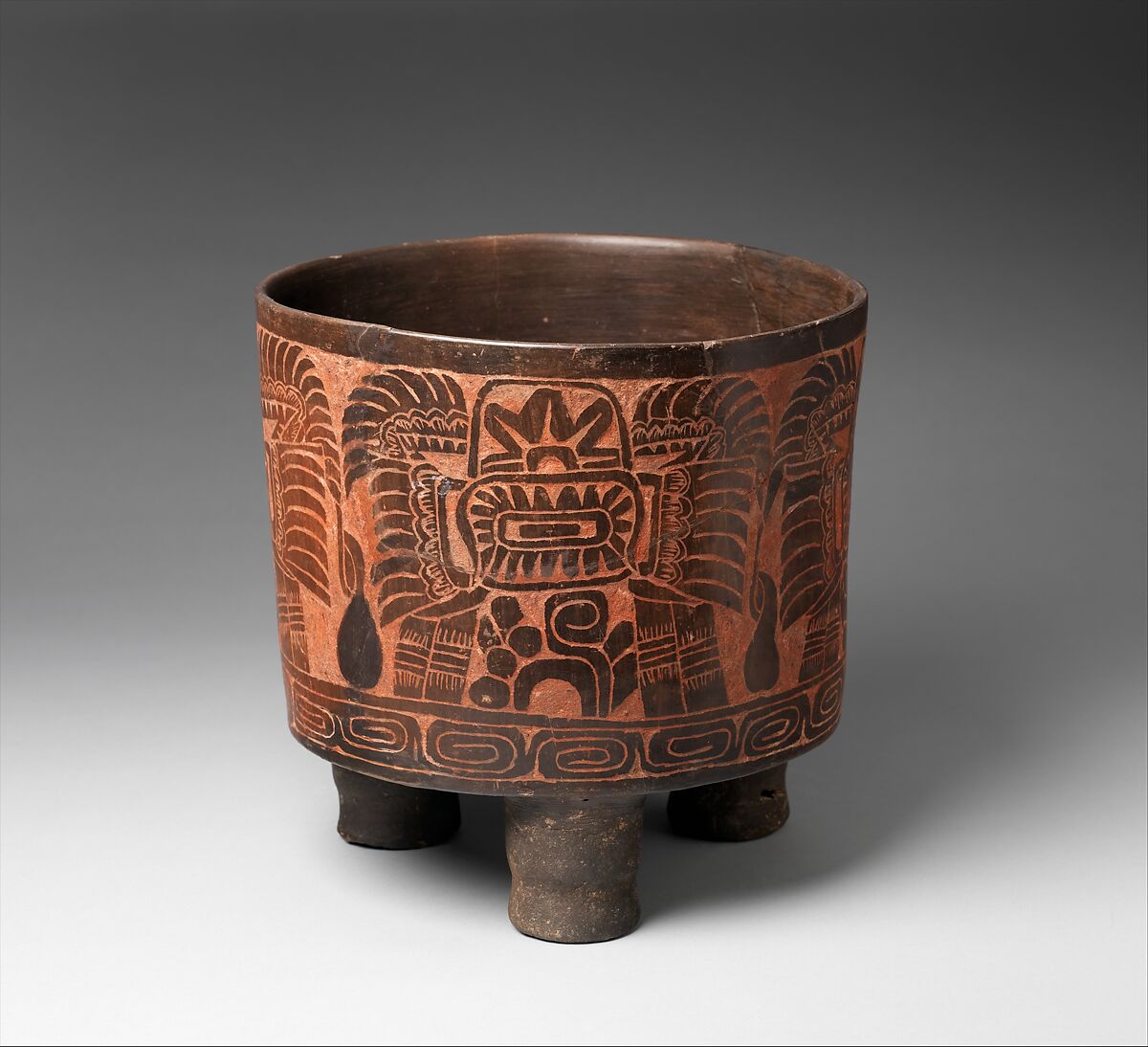A complex motif which combines a number of symbols commonly found in Teotihuacan art is repeated four times along the outer surface of this cylindrical tripod vessel, framed by a thin border above and a continuous band of interlocking scrolls below. The large, feathered border surrounding the top half of the motif resembles a headdress type reserved for the high-ranking individuals frequently depicted in Teotihuacan art (see MMA 2012.517.1). Here it frames a feathered medallion crowned with a half star. Below are pairs of tassels to either side of a symbol known as the “reptile-eye”. The dark, ovoid shapes separating each motif may represent drops of water. This method of combining individual elements to form a glyphic-like unit is typical of the Teotihuacan visual language system and here may represent a deity, an individual, or an abstract religious or social concept. While the identical motif is repeated four times, the hand of the artist is evident in minor variations, such as the number of feathers and or width of the contour lines.