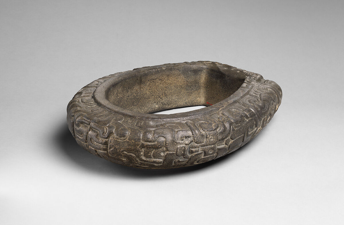 Closed yokes are among the earliest ballgame sculptures and were usually left undecorated (see MMA 69.237). The manner in which the design overlaps the deep ridges to either side of the closed end of this yoke suggests that the relief decoration may have been added later, perhaps during the Late Classic period when open yokes and other ballgame regalia were routinely covered with intricate designs. It is unlikely that closed or open yokes or any other ballgame-related stone sculptures, called hachas and palmas (see MMA 1978.412.151, 1979.206.425) could have been worn during active play. They show no possible form of attachment, and their weight alone could have hindered the players’ movements. It is even less likely that a closed yoke such as this one could have been worn at all, and so they lend credence to the argument that these are stone sculptures meant to commemorate the game and its players, intended for ritual display and as mortuary offering.