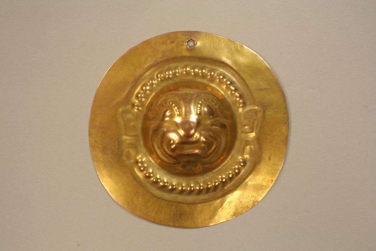 This disk, most likely a pectoral or ear ornament, is made of metal sheet. The design shows a mammalian face with semicircular eyes above which there are eyebrows comprised of circular dots. The creature has a triangular nose, a mouth in the shape of a double-headed arrow, and a trapezoidal element that extends from the mouth and suggests a tongue. Ears are outlined in a relatively rectilinear fashion on either side of the face, perpendicular to the central relief, and each ear shows an ornament hanging from it.