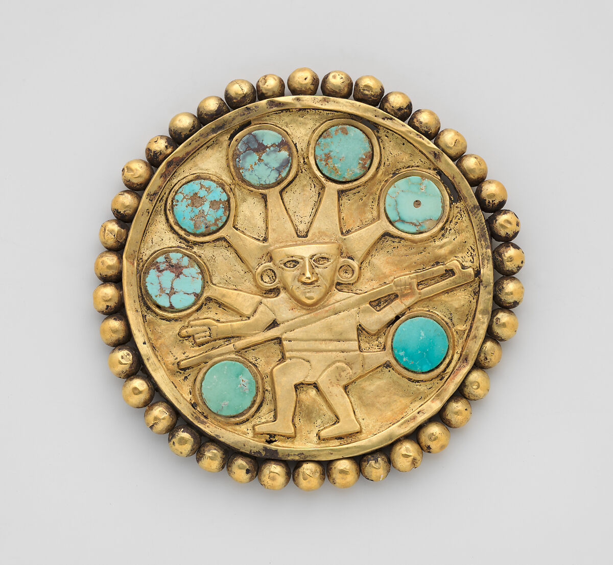 This gold disk, once attached to a cylindrical shaft to create an ear ornament, was created by Moche metalsmiths on Peru’s North Coast between the 3rd and 7th centuries. The central figure launches a projectile—likely an articulated spear—with the aid of a throwing stick while he points with his other (right) hand. The figure wears a tunic and a loincloth, the latter indicated by lightly engraved parallel horizontal lines. Raylike extensions from the head and body terminate in circular forms with raised borders, now filled with turquoise inlays. The figure itself wears two ear ornaments that may have once also held inlays, now missing. Unlike the rest of the figure, which is rendered in low relief, the masklike face is rendered in high relief. The composition is encircled by a raised plain border, and the circumference of the ornament is embellished with 38 hollow spheres soldered to the rim.