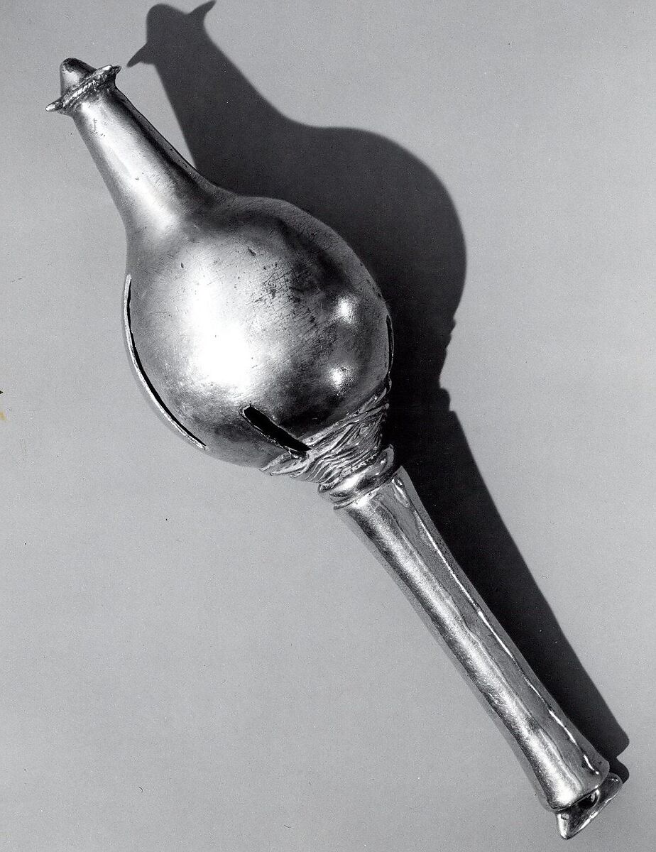 Around the base of this spherical region, there is a tangle of metal bands that suggests cords made of an organic material. People may use cords to attach the gourd to a handle in order to create a rattle. There appear to be at least nine bands from top to bottom, but they overlap one another, and some that appear to be one band may be comprised of a few. The four openings mentioned above partially cut into this banded design. Moving farther down the object, there is a rounded band of metal that is set off by slight recesses above and below it. Beyond this lower recess, the form gradually narrows before widening again. This lower region—the handle of the rattle—is approximately half the length of the object. At the end of the object opposite the finial, there is a short trapezoidal protrusion. A circular perforation appears at the center of this protrusion, and there is a shallow, circular recess perpendicular to it, on the end of the handle. This recess contains ceramic residue.