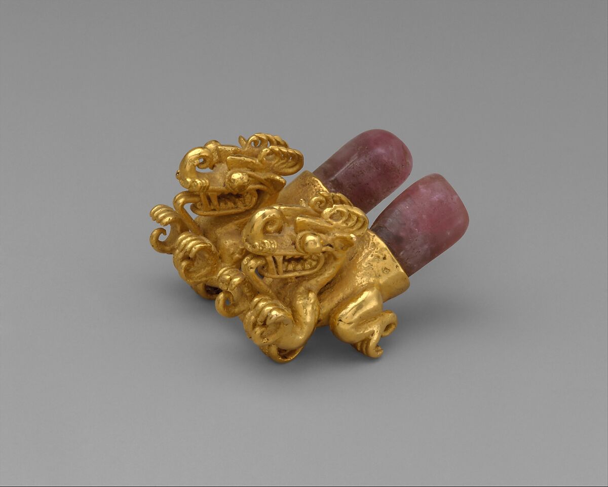 Depicted on this pendant are two side-by-side composite creatures in which the long, toothy snouts with extended, bifurcated tongues of crocodiles are combined with the curled-up noses of bats and flowing crests of iguanas. The accumulation of such specific animal features—though little understood today—may have referred to the wearer's status and the ability to control natural and/or supernatural forces. The pairing of figures is found on some of the earliest known Central American gold objects and continued until the time of the conquest. Its purpose may have been to increase the potency of the image. This cast gold pendant incorporates two stones of translucent pink quartz that depict the tails of the beasts and contribute to the visual appeal of the piece through the juxtaposition of different colors and textures.