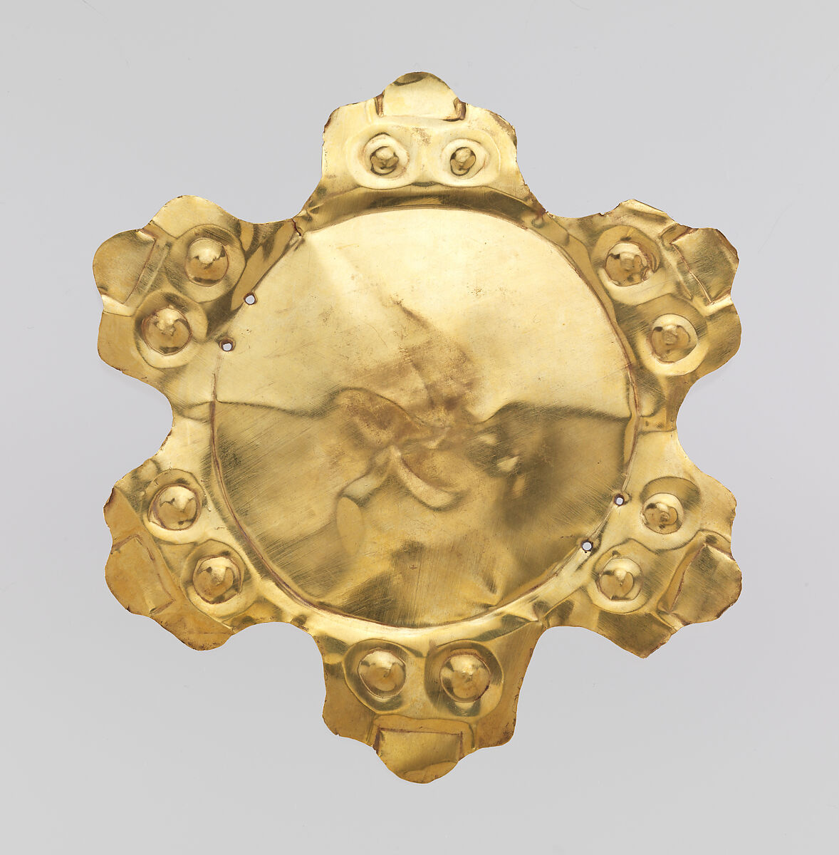 Ornaments made of hammered gold sheet or other materials were sometimes sewn to woven garments, creating a dazzling effect when catching the light and animated by the wearers’ movements. Nasca metalsmiths of Peru’s South Coast created this star-shaped ornament, one of at least nine that may have been affixed to an impressive tunic or other element of attire (see MMA 1979.206.754-.762). Each ornament has two pairs of perforations on opposite sides, allowing for attachment to a textile (a figure on a Nasca bottle, MMA 64.228.66, is likely wearing such a garment).