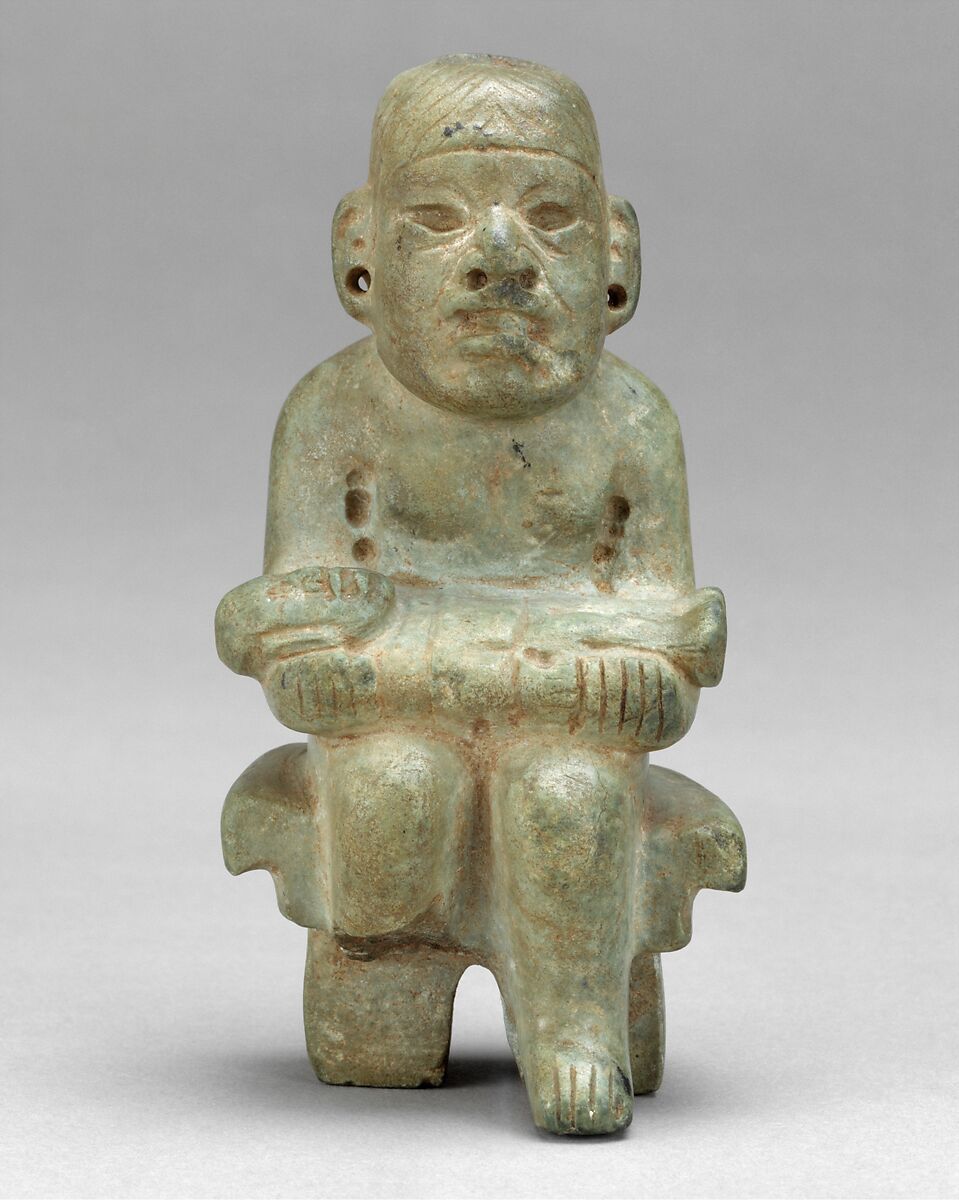 The Met's small-scale figurine is similar in theme to the famous Señor de las Limas, a cross-legged individual cradling a "were-jaguar" infant across his lap. This infant has defined limbs and a sloping head with an incised cleft. Other babies with cleft heads have been identified as personified maize sprouts, a concept that persisted into the beliefs of the much later Classic Maya, who referred to youths as "ch'ok" or "sprout." The body of the main figure is incised with mythological characters on his shoulders and knees, emphasizing the Mesoamerican belief in the four corners and a center as an organizing principle of the Olmec worldview. The baby, this maize sprout made manifest, then stands in for the center of the world. The preoccupation of Olmec peoples with child-rearing and the mythological connections between the life cycles of infants and agriculture transcend time and space.