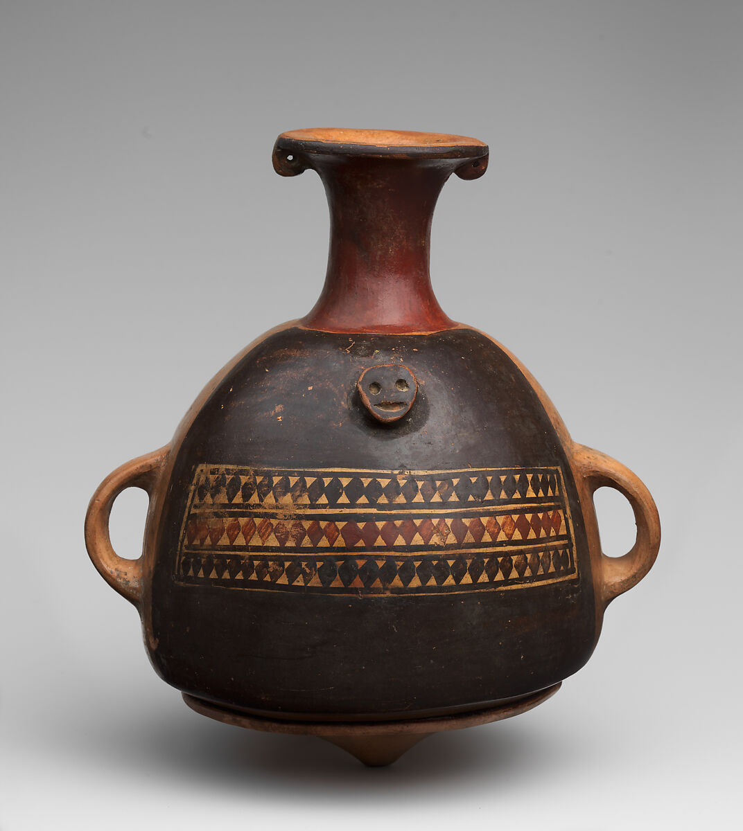 Containers with globular bodies, pointed bases, long necks, and flared rims, known as urpus, were the most recognizable form of Inca imperial style ceramics. Large urpus—up to 45 inches high—were used to carry and serve aqha (chicha or corn beer) in ritual celebrations sponsored by the Inca state. Smaller versions, as this example, served votive purposes at sacred sites across the empire.