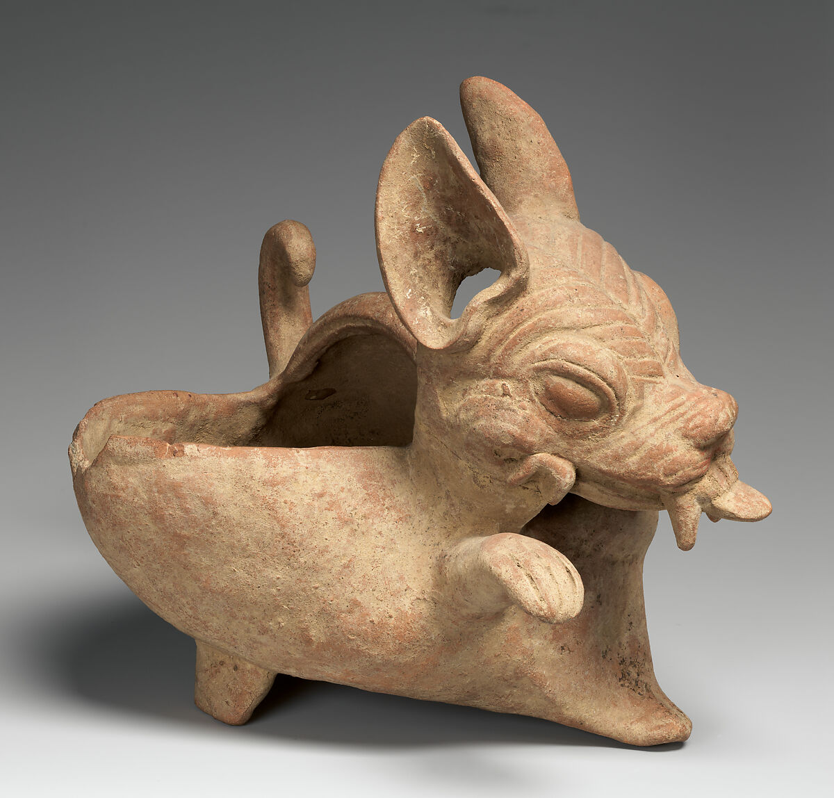 Canines are a ubiquitous presence in the ceramic sculpture of central and southern Veracruz. Artists fashioned them into figurines on wheeled axils, as zoomorphic musical instruments, sleeping dogs in affectionate pairs, and as part of vessels such as this one. This unusual example features an open bowl on one side and a canine effigy on the other. The canine resembles a xoloitzcuintle (or Mexican Hairless), a dog characterized by large, erect, pointed ears, a long, tapered snout, dental abnormalities, and close-fitting, hairless skin that is prone to wrinkling, especially on its face (conveyed on this vessel as incised lines on the dog’s ceramic face and body). With one paw raised, the creature appears oddly playful, but its prominent front teeth, unusually long fangs, and a second set of protruding, curled fangs suggest an otherworldly being.
