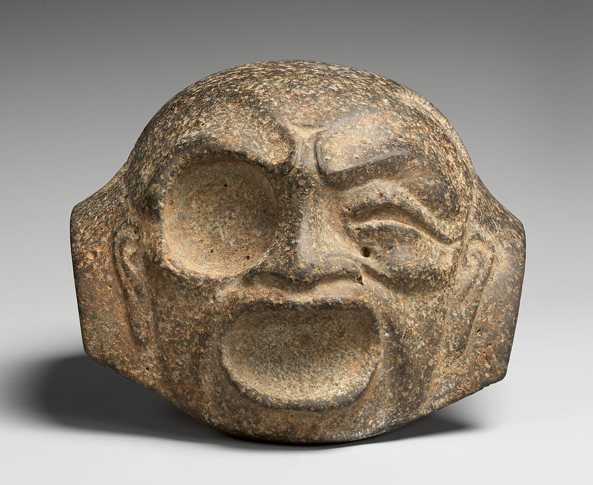 The sculptor created a vision of pain and distress with deeply contoured features, including a frowning brow and gaping mouth, as if the individual is frozen in mid-scream. Small ears are indicated on the flanges to either side of the face. Several examples of this type are known, leading to their designation as tuertos (“one-eyed,” in Spanish). The yuguito form has been associated with ballplayer regalia based on later depictions of players, indicating that the figure may have been representing a vanquished enemy when using the stone in play.