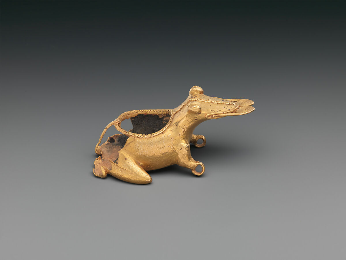 All of these details would have been designed originally in wax. The chevron band has the appearance of filigree but the artists created this design by plaiting two threads of wax. They formed the entire wax model around a core that was likely a combination of clay and charcoal. During the casting process, the frog’s interior would have been mostly filled with this core material. Artists covered the wax model with ceramic investment, and melted out the wax to create a mold. This mold was then possibly pre-heated, and molten metal was poured into the space formerly occupied by the wax. Once the metal solidified, the artists broke open the hardened ceramic investment to release the cast object. Portions of the original core are still preserved in this example.