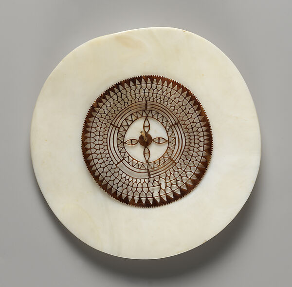 The kapkap is a form of adornment found throughout Solomon Islands, Island New Guinea and parts of mainland Papua New Guinea. The term kapkap originates from New Ireland, where this example was made, but has also become widely adopted in museums for related adornments from across the region. Kapkap are comprised of a polished disk of giant clamshell (Tridacna gigas) overlaid with a delicate fretwork of carved turtle shell. Throughout Oceania, the luminosity, hardness, and durability of the giant Tridacna clamshell are highly valued. While the grinding of the clamshell into a perfectly round disk is undertaken by a group of men, the carving of the turtle shell is performed by a single specialist (the aitak) who works alone and in seclusion. The turtle shell and clamshell are then tied together using string that is threaded through a hole in the center of the disk. Some kapkap incorporate an additional element of a colorful seed pod or glass trade bead at its center. The materiality and manufacture of kapkap both indicate the prestige of these adornments. It takes immense skill to carve the turtle shell into such intricate and symmetrical geometric designs. The circular form and solid permanence of the clam shell disks also refers to the cyclical and eternal nature of time.