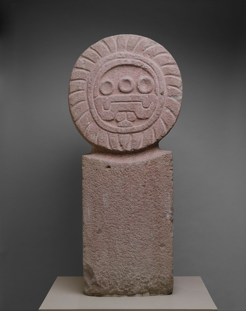 Stone stelae in ancient Mesoamerica served as territorial markers, calendric or historic monuments, or markers for the ritual ballgame. This example, sculpted in a reddish volcanic stone in a style associated with the central Mexican metropolis of Teotihuacan, consists of a circular medallion atop a plan rectangular body. The main disk is carved in relief to reference a perishable feathered standard, in which a central roundel is surrounded by a spray of feathers. The circular field in the center contains an abstracted image. Three circular areas in a horizontal line hover above a u-shaped motif, below which emerge other round shapes.