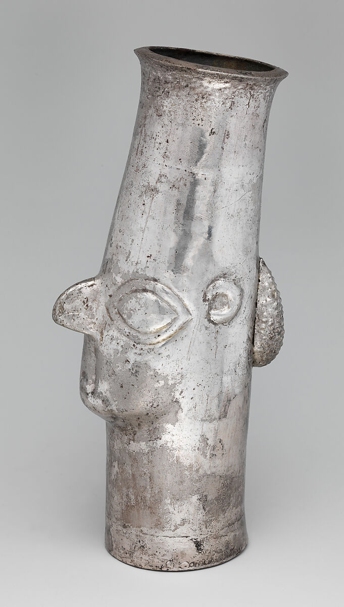 The beakers were made in different sizes, from two to sixteen inches in height. Some are straight-sided, while others have flared bases and stepped tops. Many were made from a single sheet of silver by hammering the metal over carved wood molds that are flat in back and held in place by a wedge during hammering; others have soldered seams along the back and bottom. Although the faces on the beakers are quite standardized, the mouth usually downturned, there is great variety in the depiction of headdresses worked in repoussé. Many have stylized corncobs at the back of the head, in repoussé or attached by soldering, perhaps a reference to the use of such beakers for drinking chicha, a fermented corn beer, during rituals.