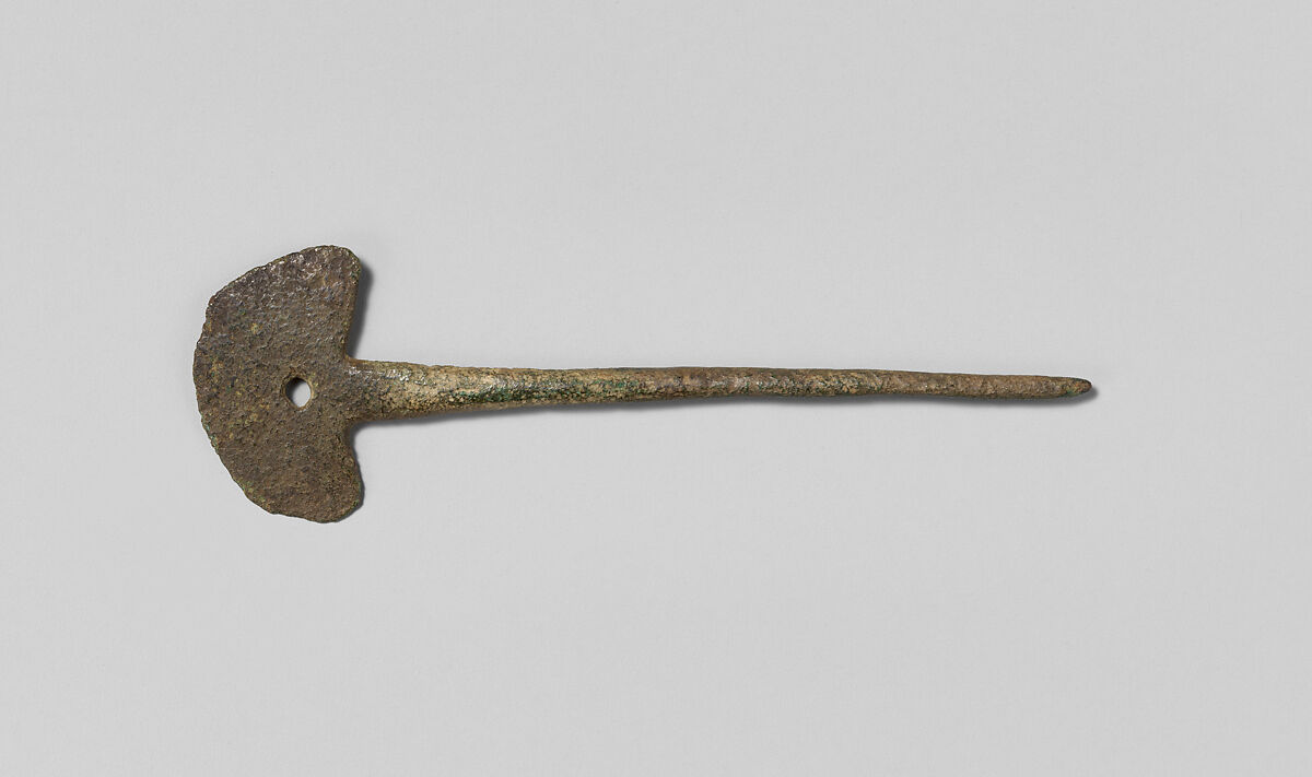 Tupus of this form have been documented from the highlands of Ecuador to North Central Chile and Northwest Argentina, based on a sample of 89 such tupus (Burger and Salazar 2012, fig. 2.2c). The lack of archaeological provenance or documentation for this object, however, makes it difficult to associate it with a particular cultural context. Across this wide geographic landscape, people, typically women, have worn and wear today tupus or variants of tupus in order to fasten garments. A person may use a pair of tupus to fasten a large cloth (acsu or anaco) that wraps around the body and a third to secure a cloth over the shoulders (lliclla) (e.g., Metropolitan Museum of Art 1995.109). (For more information on the wider history of tupus, please see Metropolitan Museum of Art 64.228.702). In describing an Inca tupu recovered from La Paz similar to the present example, but made of gold and slightly longer (9.4 cm), Fernández (2015, 43) suggests that this form of tupu, with its semicircular head, resembles that of a tumi, a ceremonial knife produced in the central and southern Andes.[3]