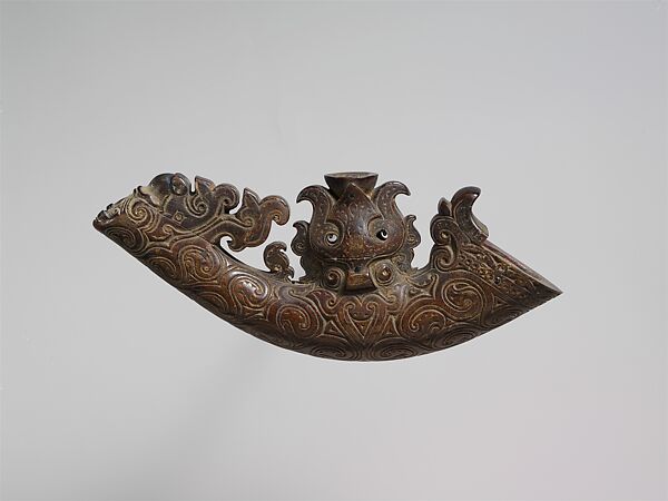 Toba Batak chiefs carried their own personal supplies of gunpowder in containers such as this one, which were carved out of water buffalo horn. This parpanggalahan was worn suspended around the neck by threading a chain or cord through two holes in the central projection of the horn, which portrays the face of a singa (a mythical creature symbolizing power, protection, and prestige). Three horns protrude upward from the face, incorporating features of the water buffalo that often appear in depictions of the singa. The central horn is shaped like an arrowhead, while the horns to either side curve outward at the top. The small crescent-shaped mouth, which is flanked by curving forms and ends in what appear to be stylized hands, is incorporated into the sinuous designs that cover the surface of the gunpowder container.