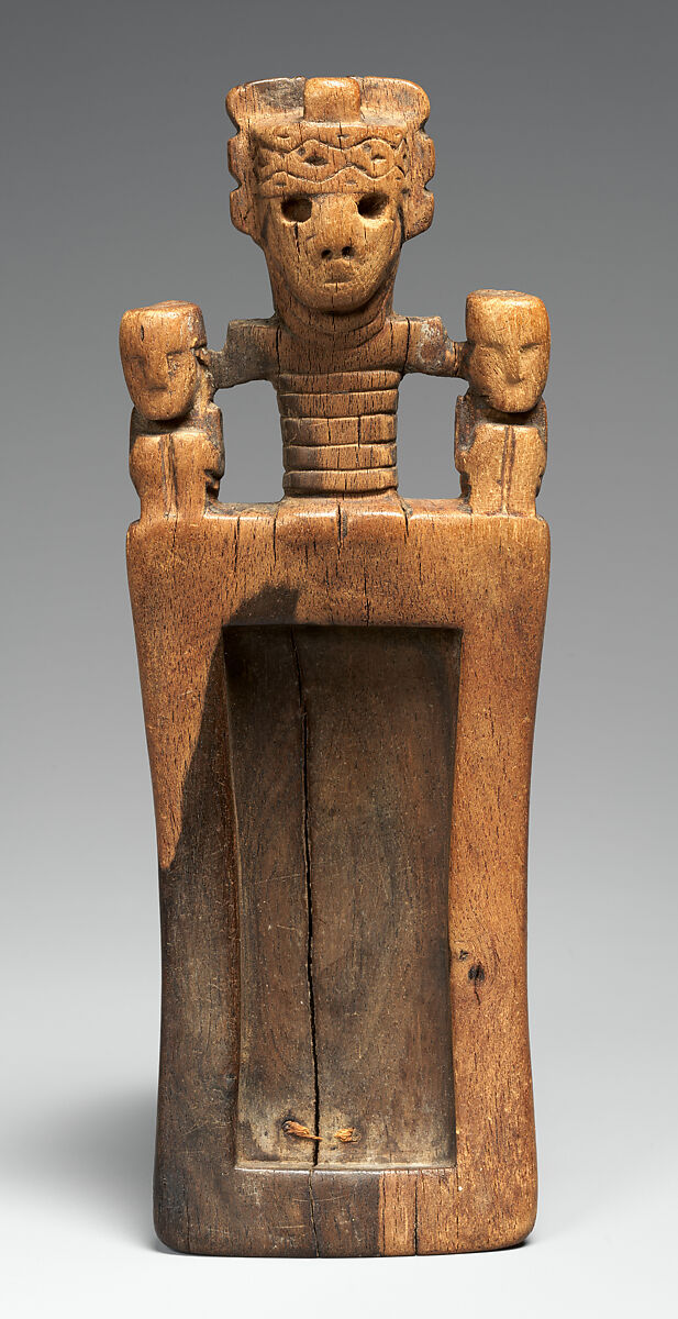 Snuff inhaled through tubes from small trays or tablets such as this one was a widespread practice in Precolumbian South America. In the San Pedro de Atacama region of northern Chile a large number of snuff trays have been found in burials in association with other paraphernalia, such as inhaling tubes, spatulas, small mortars and pestles, and snuff-powder containers. The snuff was prepared from the leaves, resin, and seeds of plants, many of them hallucinogenic, which were dried and finely ground. Historic and current data suggest that snuff had many purposes in the Andes: it was used to cure various ailments, to alleviate pain and hunger, to provide alertness in war and hunting, and to induce trances during rituals and religious ceremonies. The tray is decorated at one end with three carved figures. At the opposite end are the remains of an indigenous repair, a tie preventing a split, running the length of the tray, from widening.