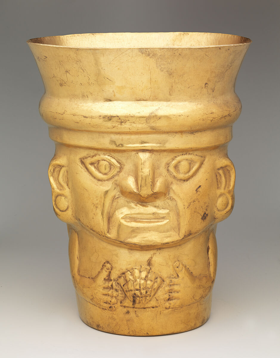 This gold drinking vessel in the shape of a figure displaying a shell comes from the Lambayeque culture of Peru’s north coast and was created for use in ceremonial feasts before it was eventually deposited in the tomb of a high-status individual. This type of vessel shape originated in the south-central Andes, where tall ceramic beakers with flaring rims were popular in the earlier Tiwanaku and Wari cultures. A few examples of beakers made of precious metals and sculpted in the shape of a head are known from these southern cultures, but they do not appear to have been made in large quantities. After the ninth century CE, however, vessels made of precious metals were made in greater numbers farther north, in the Lambayeque region, near the modern city of Chiclayo. Prior to this time, ritual vessels on the north coast were made in the shape of goblets, and probably exclusively of fired clay. By the beginning of the Late Intermediate period, or around 1000 CE, production of objects of silver and gold reached epic proportions. As many as 176 gold beakers were said to have been found in a single tomb at the site of Batán Grande, a large ritual center of the Lambayeque culture (also known as Sicán) in the La Leche River Valley. Reportedly arranged in groups of ten according to size, shape, and iconography, the beakers were undoubtedly created in a centralized workshop, using standard-size ingots or blanks that were then shaped over a form. The sheer number and quality of the works speak to the Lambayeque lords’ prodigious workshops and their control over resources.