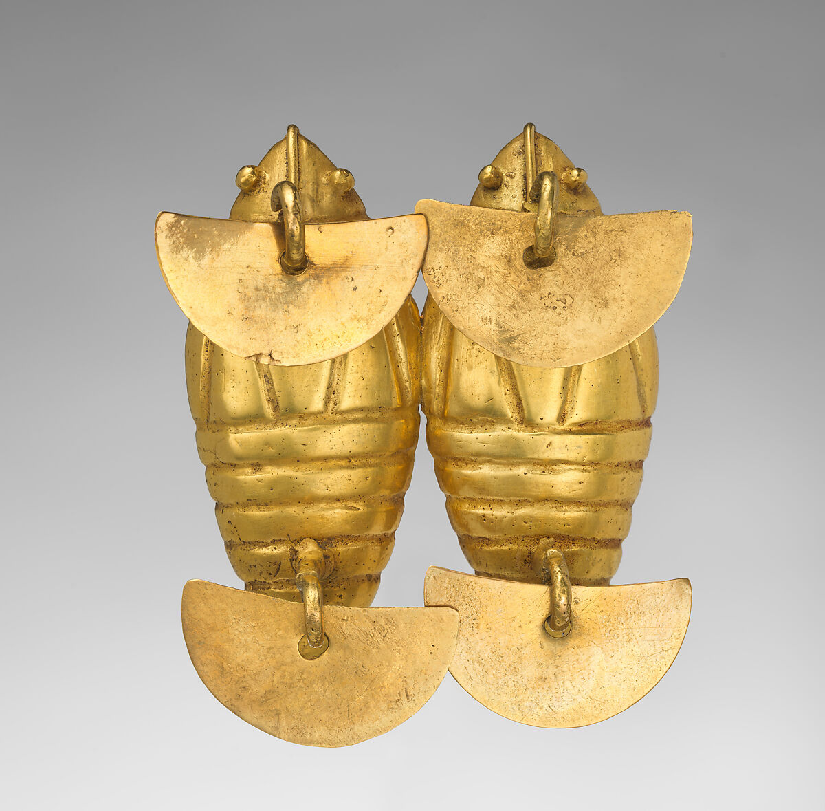 Lost-wax casting was the primary means used to make this object (for more information on this process, please see Metropolitan Museum of Art 1974.271.48). Metalworkers shaped the insects and their shells first in wax. The horizontal and diagonal lines on the pendant were carved into the wax, while separate bits and threads of wax were added to form the eyes and vertical band on the head. The hooks on the front and the loops on the reverse also were designed in wax and likely cast with the rest of the pendant. The object was cast with an open back, and the ceramic core would have been located in the cavity that is now visible on each insect. To create the danglers, metalworkers hammered gold sheet to the current thinness of the danglers and chiseled out their shape. Finally, they made a circular perforation at the top center of each dangler so that it could be threaded onto the hook. Between its excavation and the present time, the pendant was highly polished, but some polishing may have taken place just after its fabrication, too.