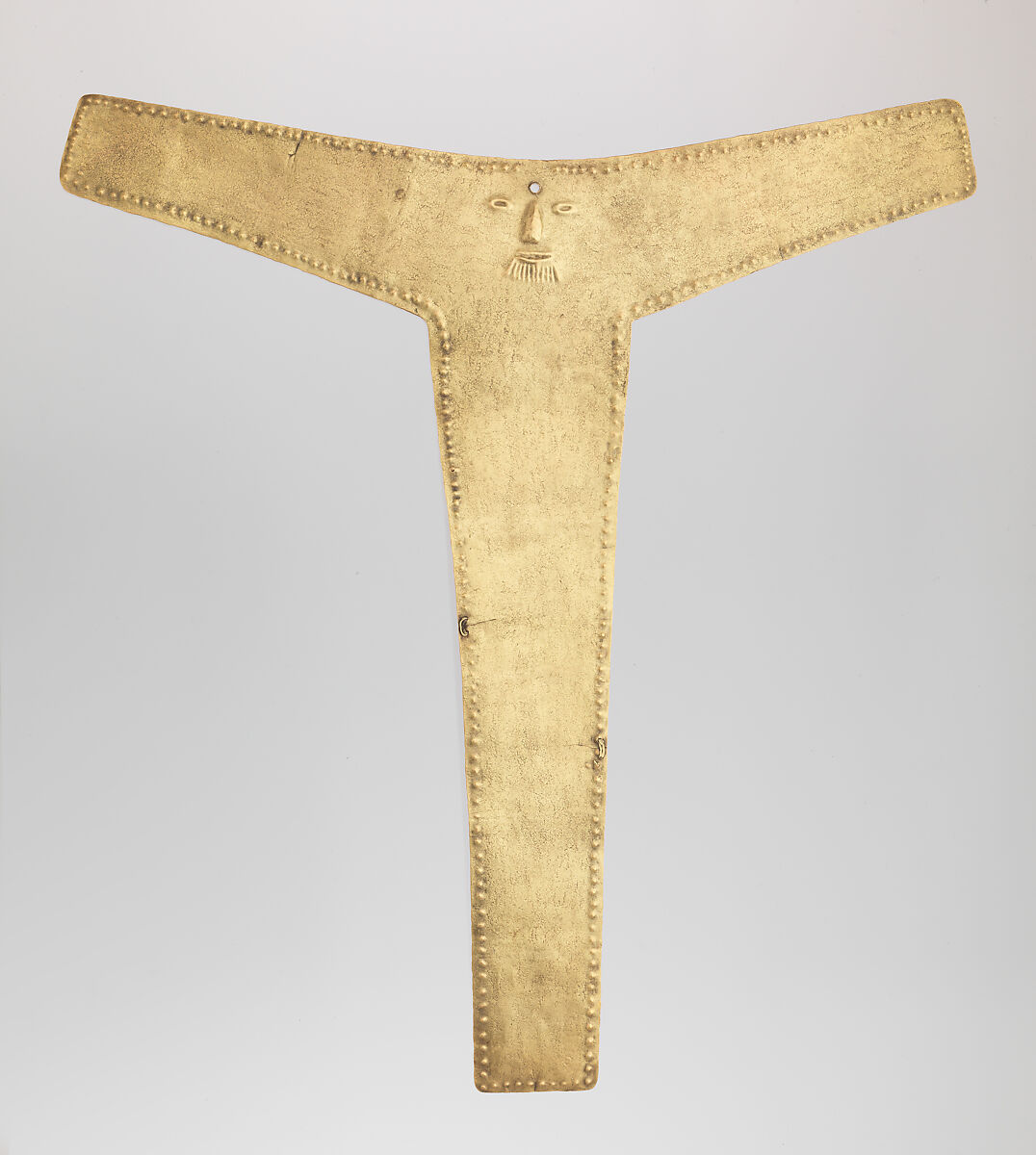 In the last few centuries before the Spanish conquest in the 1530s, metalworkers in Colombia's middle Cauca River valley produced impressive ornaments that relied entirely on shape and surface quality for impact and presence. Gold had been worked into personal ornaments in this region for over a thousand years. Pectorals from earlier periods were very large in size also, but were elaborated and embellished with repoussé patterns and free-hanging elements. This striking T-shaped pectoral has a small face with eyes, nose, and mouth rendered in low relief on the flat surface in the center near the top. A beard or possibly a lip ornament appears beneath the mouth. There is no indication of a head. The entire edge of the simple yet elegant form is outlined with a row of raised dots. The interpretation of the human face on the inorganic form is challenging; it may be a highly abstract rendering of an anthropomorphic image.
