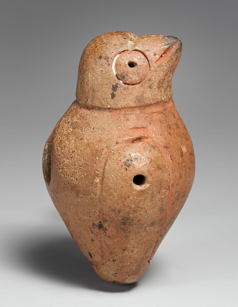 Music was an important part of life in ancient Peru, and a variety of instruments, including whistles, trumpets, drums, and flutes dating back to the earliest cultures are known. This small whistle (ocarina in Spanish) in the shape of a bird is one of a group of similar objects (1992.60.2, 1992.60.1, 1992.60.3) created by artists of the Cupisnique culture of Peru’s North Coast in the years between 1200 and 500 BCE.