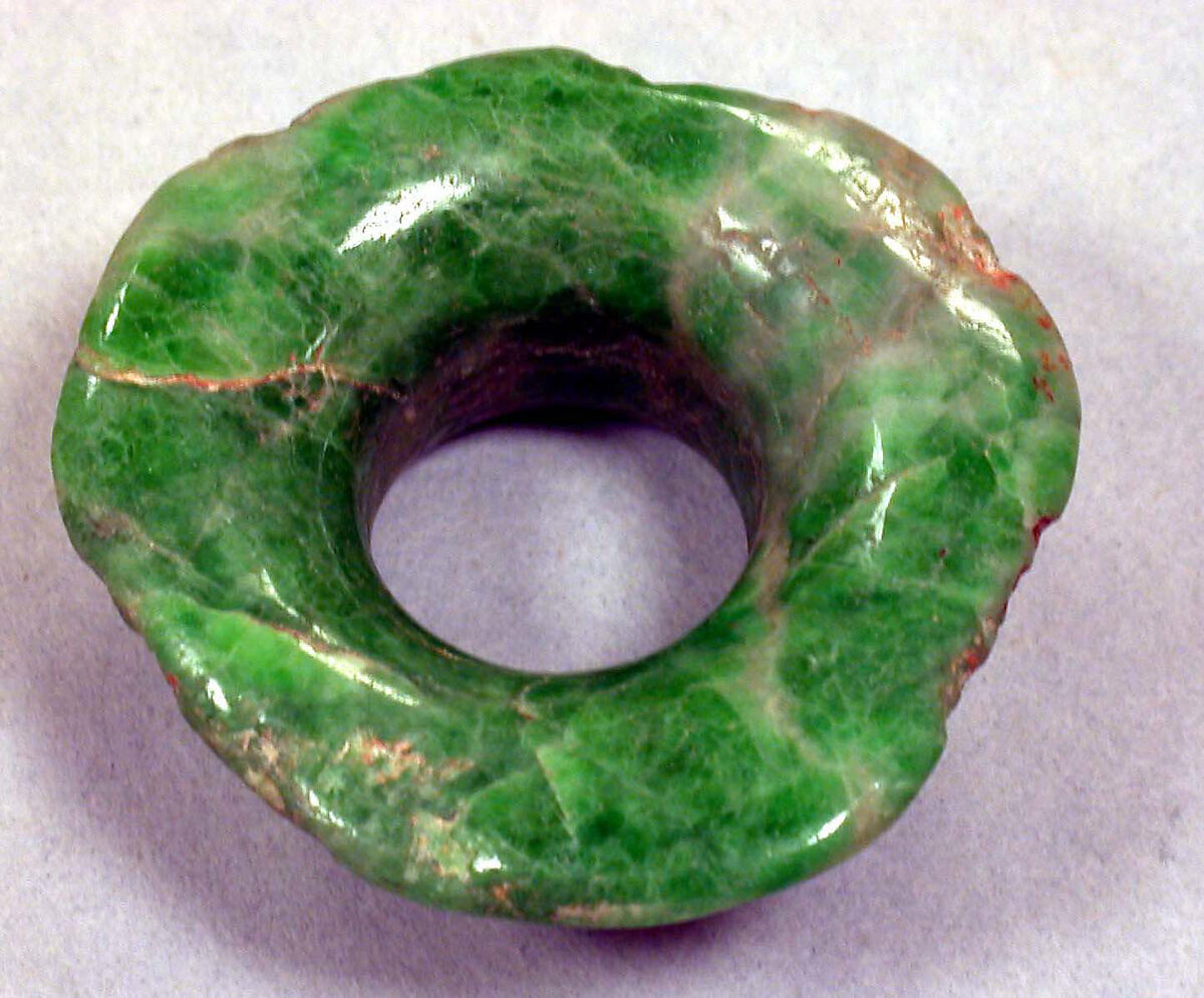 Jade approaches 7 on the Mohs scale of hardness (diamond has a hardness of 10), so it is extremely difficult to carve. In order to transform a raw jade boulder into a polished, finished form, specialists used a combination of percussion and abrasion techniques (such as pecking, grinding, sawing, incising, and drilling). This work was repetitive, time consuming, and required a highly specialized skillset. Creating a finished piece from the rough boundaries of raw jade would have been enormously slow and difficult work, a fact that would have likely increased the value and preciousness of the final product.