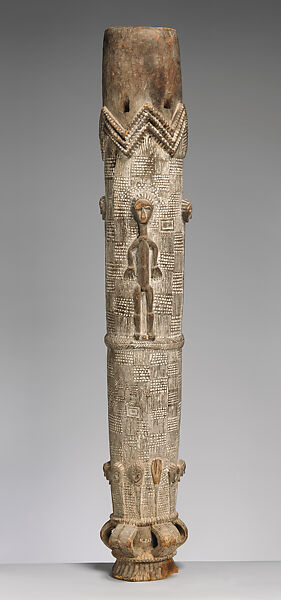 Each Lagoon peer group marked its ascent from youth to adulthood by acquiring a fokwe mi. These monumental drums were the focus of rites of passage that dramatized the transfer of power from one generation to the next. While a rising cohort might commission its own instrument from a specialist, age-mates might alternatively steal the drum of a more senior cohort. Played at an angle because of its exaggerated height, a fokwe mi issues a deep, resonant voice that signals an ancestral presence. Here a rhythmically incised surface has been enhanced by the application of white kaolin. The chevron "warrior" motif, called sagohin, and stool-like base signify the collective power of the emerging age-grade, itself represented through a ring of tsuan huen (carved heads).