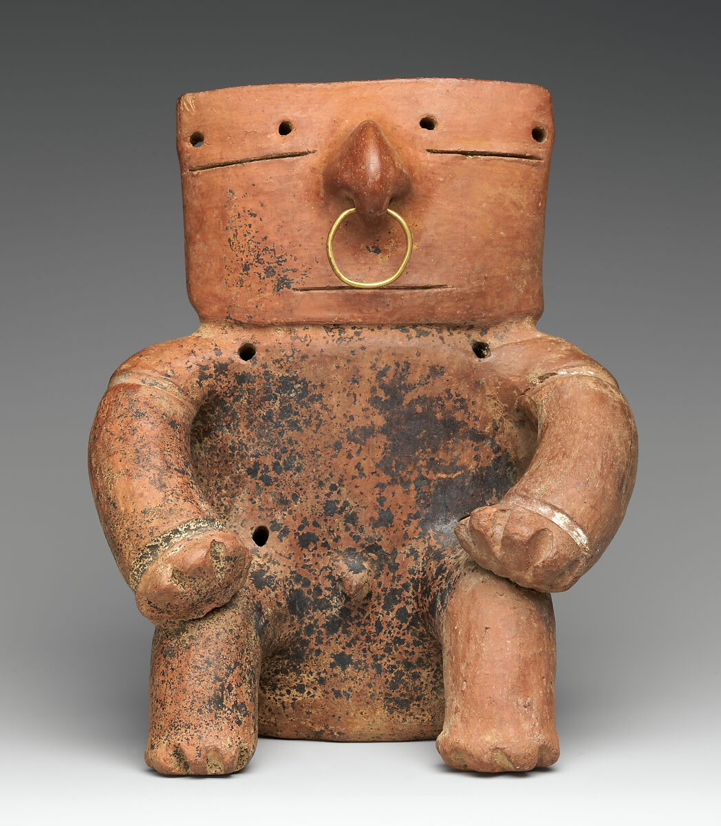 This figure shows a person in a seated pose. It is primarily made of fired clay and was produced by people living in the middle Cauca River Valley and parts of the Central Cordillera of Colombia, often referred to as the "Quimbaya" region. The eyes and mouth consist of narrow horizontal linear incisions, while the nose is rounded and projects outward. A metal ring has been threaded through the nostrils. The figure’s arms are bent and turn inward, with the hands resting on the knees, which are bent. There are seven circular perforations along the top of the figure’s head, while there are four across the forehead, two above the chest, two more at the waist, and one on the bottom of the figure. With the exceptions of those on the top of the head and the bottom of the figure, all the perforations extend entirely through the figure. There are four recessed bands or ligatures on the figure’s arms, likely indicative of ornaments, two closer to the shoulders and two at the wrists. These bands do not extend around the entire arm. Interestingly, the figure is top-heavy and needs support in order to sit upright, raising questions over how it was displayed and used in the past.