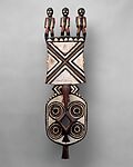 Bwa plank masks are conceived to embody supernatural forces that act on behalf of the families that commission and use them. In this example bold linear designs are juxtaposed with sculptural elements that extend the flat planes of the composition. These elements include a hook form projecting between the interstice of the rectangular and circular fields and three figural representations that stand at the summit. The patterns and iconography that enhance individual works are carefully described to the artist by clan elders. These graphic elements are not merely drawn upon for their aesthetic qualities but are symbols associated with oral histories taught to young initiates and inscribed upon their bodies. In Bwa culture certain socially marginal personages, such as foreigners, dwarfs, or lepers, are perceived to facilitate contact with the spirit world. Their representation in masquerades may be discerned through the overall performance rather than the mask's iconographic features. Contextual information for this work was documented by Christopher Roy in the village of Boni in 1983.